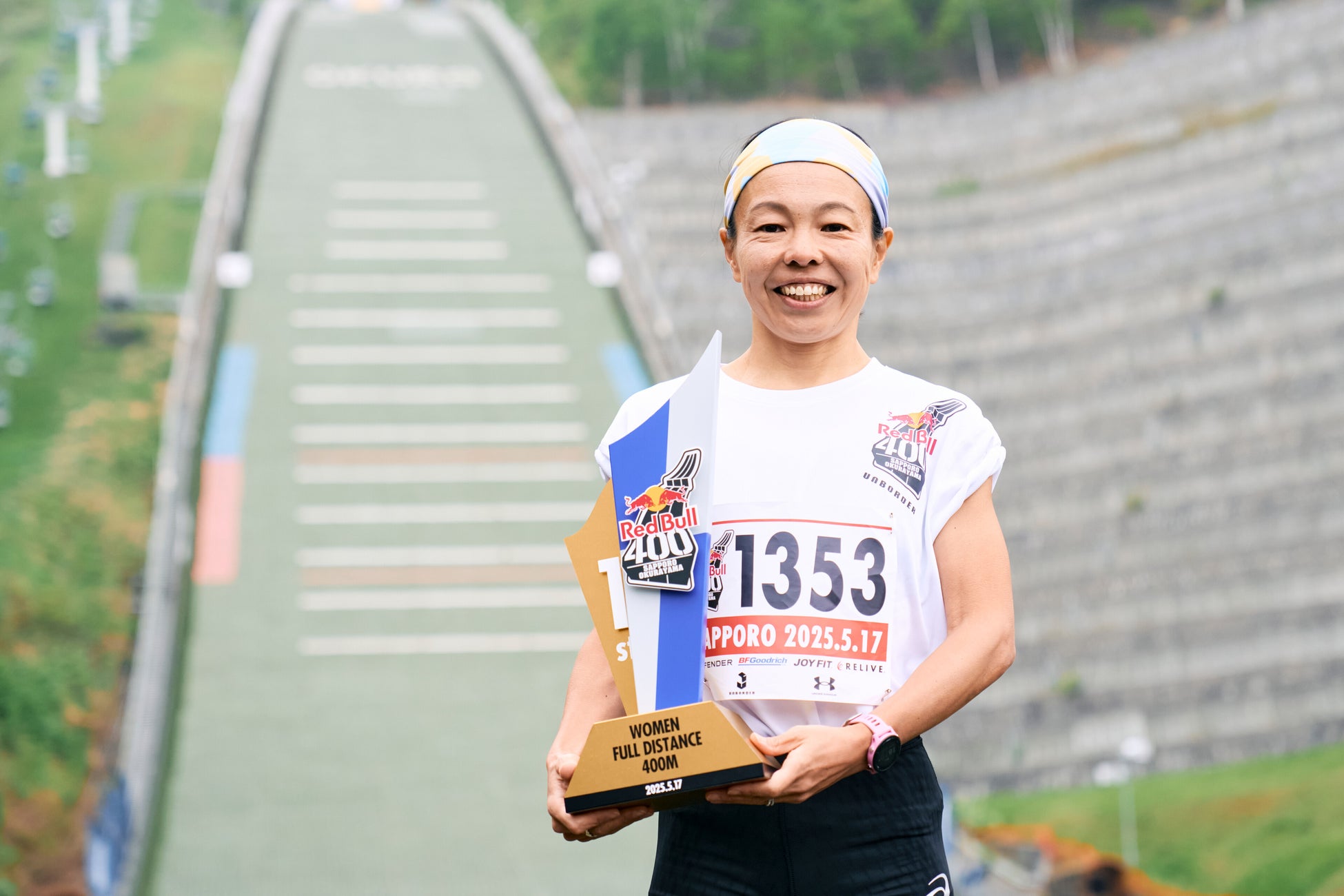 予選を1位通過したのは、2019年韓国で開催された Red Bull 400での優勝経験を持つ実力者で韓国出身のHyunji KANGさん。決勝では、序盤から首位をキープし、予選の疲労を感じさせない驚異的なスピードで、他の追随を許さない走りを展開しました。しかし、ラスト100mで昨年の覇者、布施愛里さんが怒涛の追い上げを開始。中盤までKANGさんとの差を許していたものの、ゴール直前の急斜面で一気に加速して首位を交代。そのままの勢いでフィニッシュラインを駆け抜け、大会2連覇を達成しました。布施さんの勝利タイムは、昨年を上回る5分11秒。女王の座を守り抜いた劇的な勝利となりました。