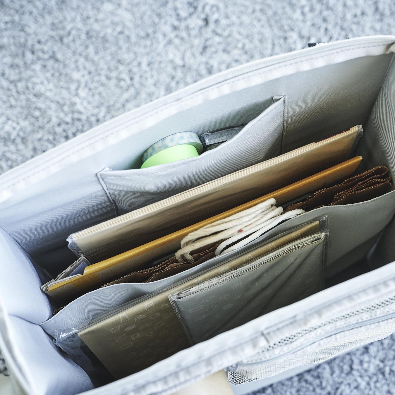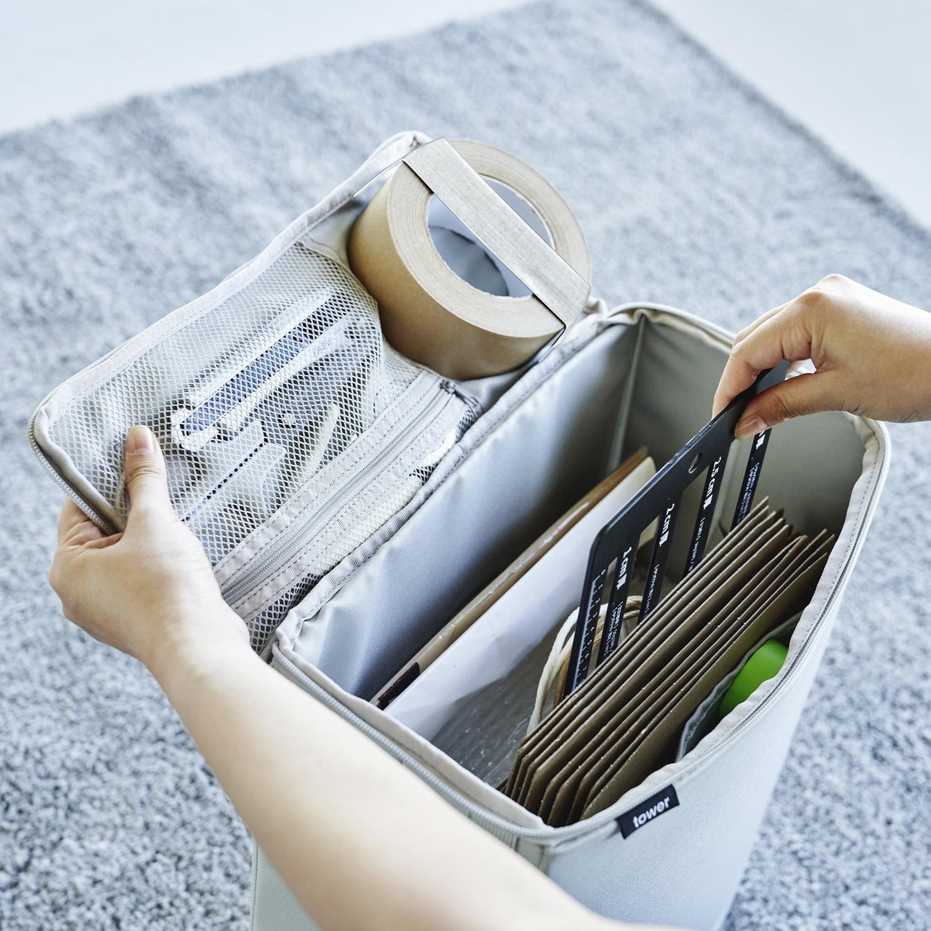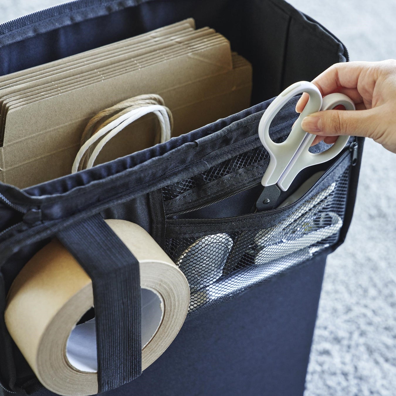 カッターやハサミなど梱包時に使用する道具を収納できるファスナー付きポケットや小物を収納できる内ポケット、資材を種類ごとに整理しやすい仕切り付きです。