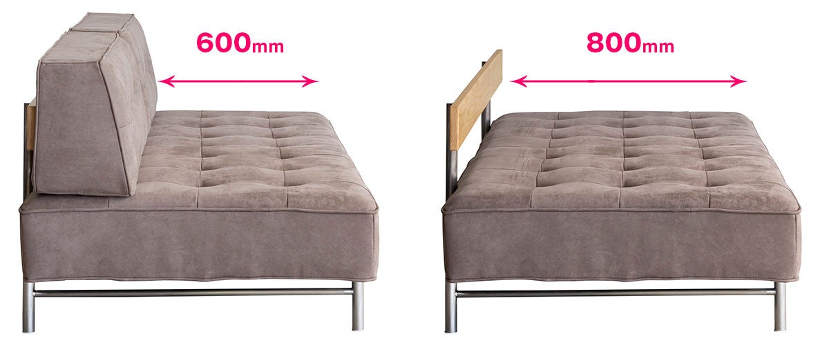 ハーマンソファは、ゆったりと使えるワイドな座面が特長。横になってくつろぐことを考えて設計しており、背クッションは取り外しできる仕様になっています。背クッションを外すと、座面の奥行きは800mmになり、セミシングルベッドの幅に近いサイズ感です。ソファでお昼寝をされたい方や横になって過ごしたい方におすすめな2WAYソファです。