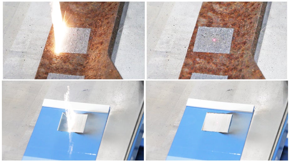 写真上:サビ除去(左 レーザー照射中、右 レーザー照射後)