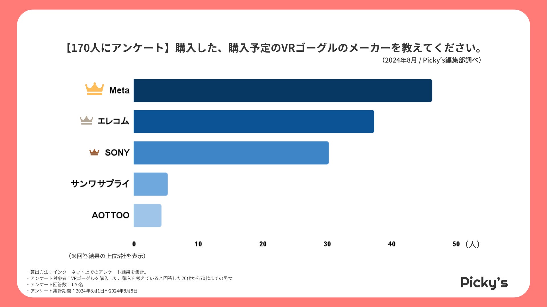 VRゴーグルのメーカーとして最も人気が高いのは「Meta」であり、Oculusシリーズなどで知られる同社が市場で圧倒的なシェアを持っていることがわかります。