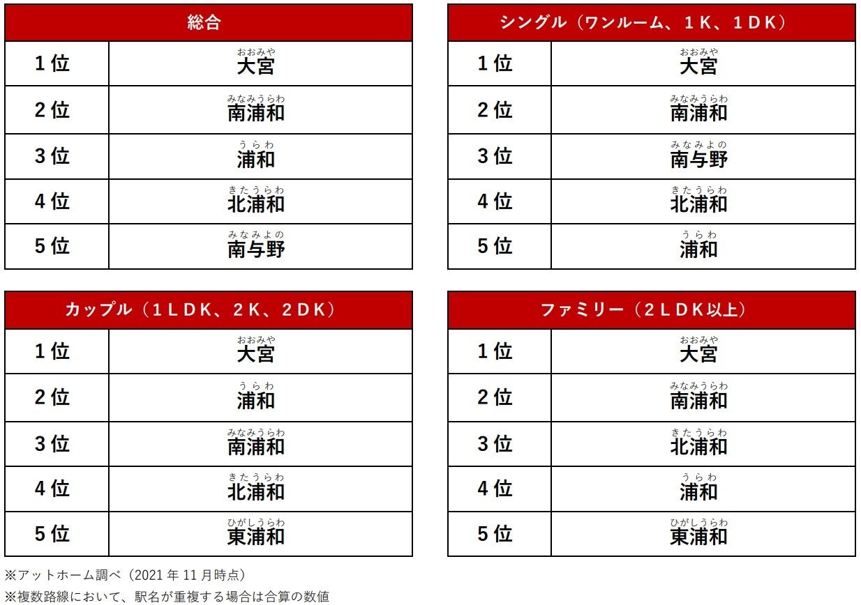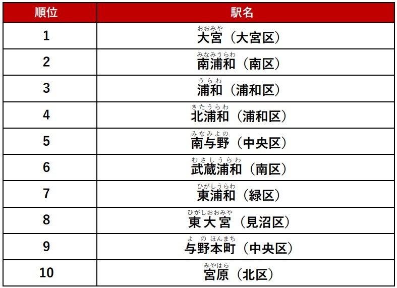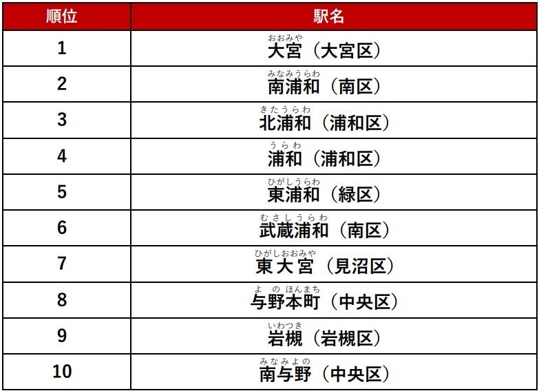 不動産情報サービスのアットホーム株式会社(本社:東京都大田区 代表取締役社長:鶴森 康史 以下、アットホーム)は、「不動産情報サイト アットホーム」で賃貸居住用物件において、PV数が多い人気の駅をまとめた「アットホーム人気の駅ランキング さいたま市編」を発表します。