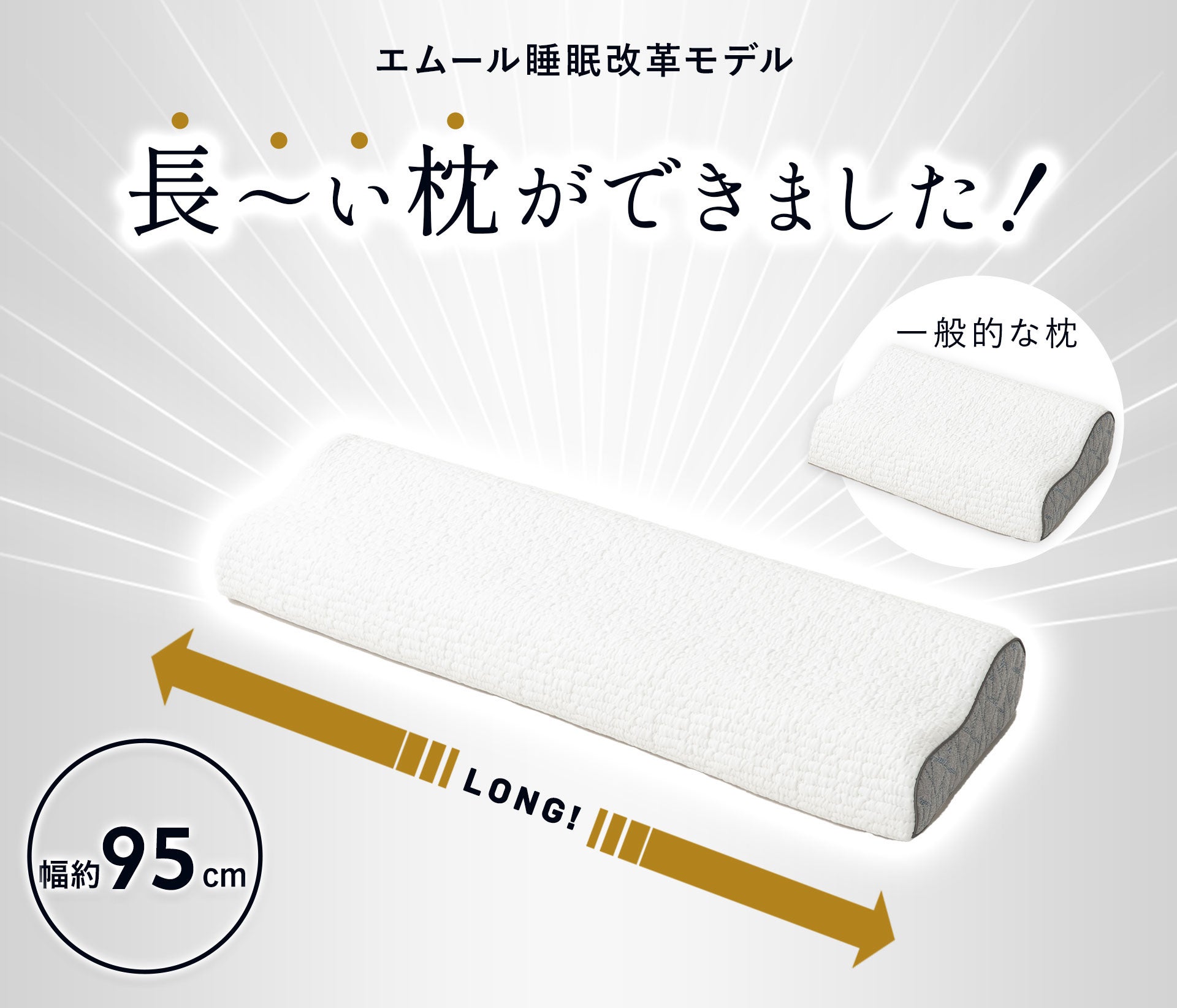 寝返りのたびに頭の位置を気にする必要は、もうありません。超ロング設計の本商品は、多くの一般的な枕とは一線を画す“睡眠そのものを見直す”ための改革モデルです。エムールは、毎晩の眠りのお供に超ロング枕を提案します。