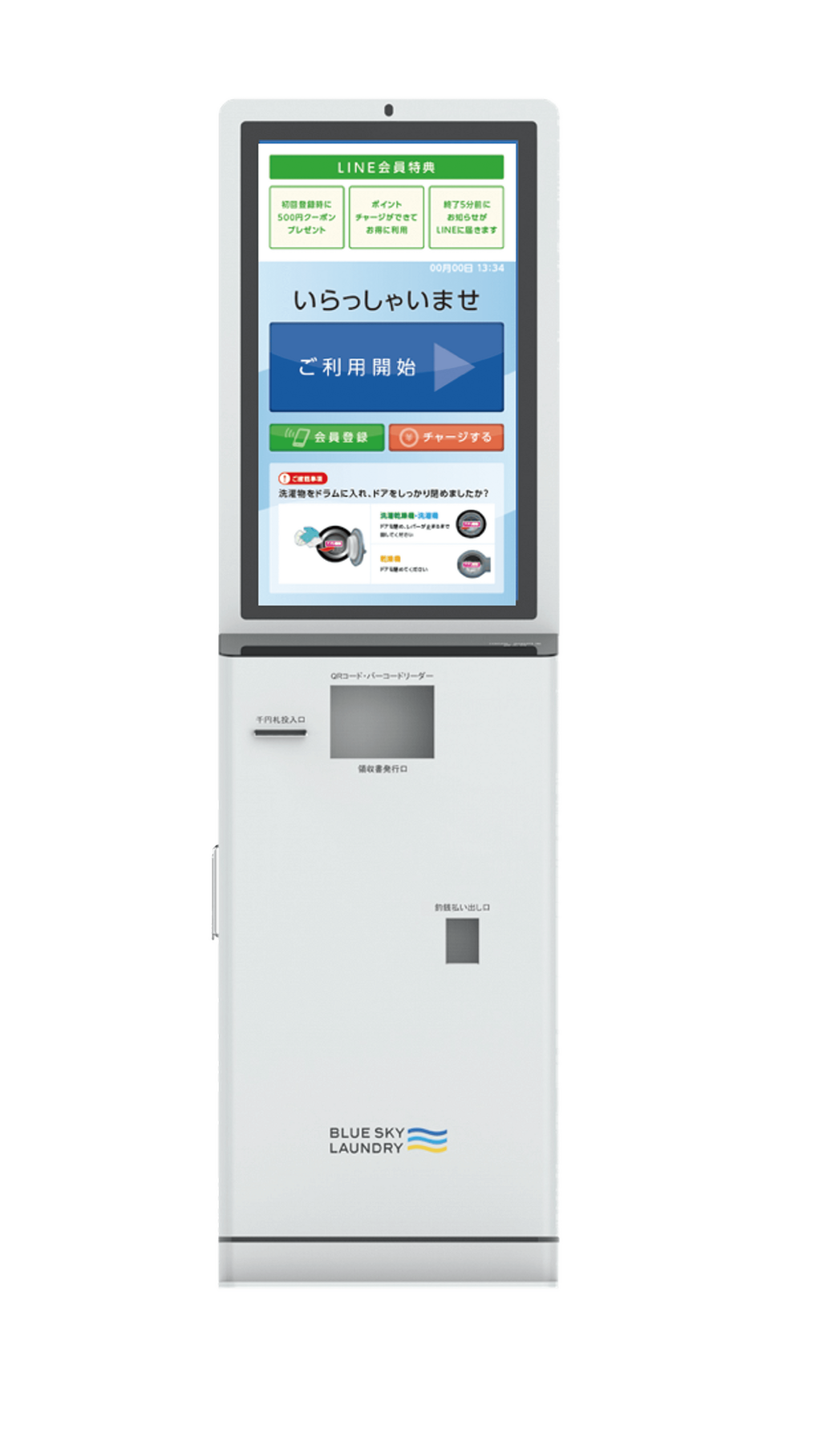 キャッシュレス決済が可能なブルースカイランドリー専用精算機「ブルスカなび2」を設置し、ランドリー機器のお支払いをすることができます。加えて、こちらの機器は国内アクティブユーザー月間9,200万人を超えるソーシャルメディア【LINE】と連携させる事により、お客様の利便性を向上させた精算機となります。