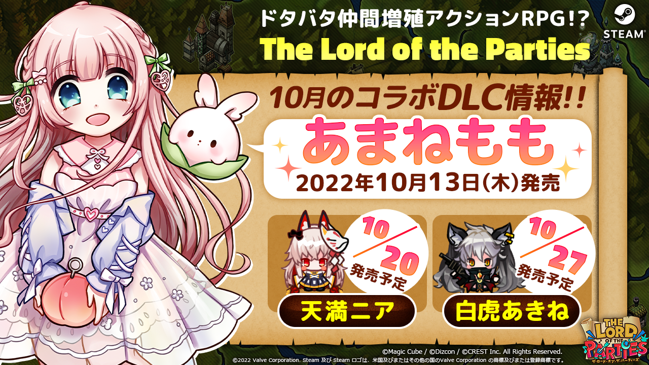 株式会社CREST(本社:東京都新宿区、代表:三上政高/梁 俊模、以下「CREST」)は、Magic Cube/Dizconが制作し、CRESTから発売中のアクションRPGゲーム『The Lord of the Parties』において、VTuber「あまねもも」(株式会社pesca所属)のコラボダウンロードコンテンツ(以下「DLC」)を本日10月14日(金)から配信開始いたしました。発売価格は410円、バンドルでは1週間限定で30%オフにて発売いたします。