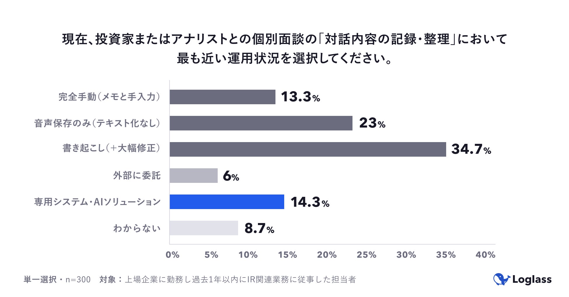 IR担当者が本来注力したい業務では経営戦略の提言(44.7%)とエンゲージメント強化(43.0%)が上位。一方で投資家との個別面談の記録・整理では、完全手動・音声のみ・書き起こし修正の合計で71.0%を占め、アナログ〜半アナログの運用が目立つ。専用システム・AIを活用している企業は14.3%にとどまり、記録・整理に時間が取られやすい実態が重なる。