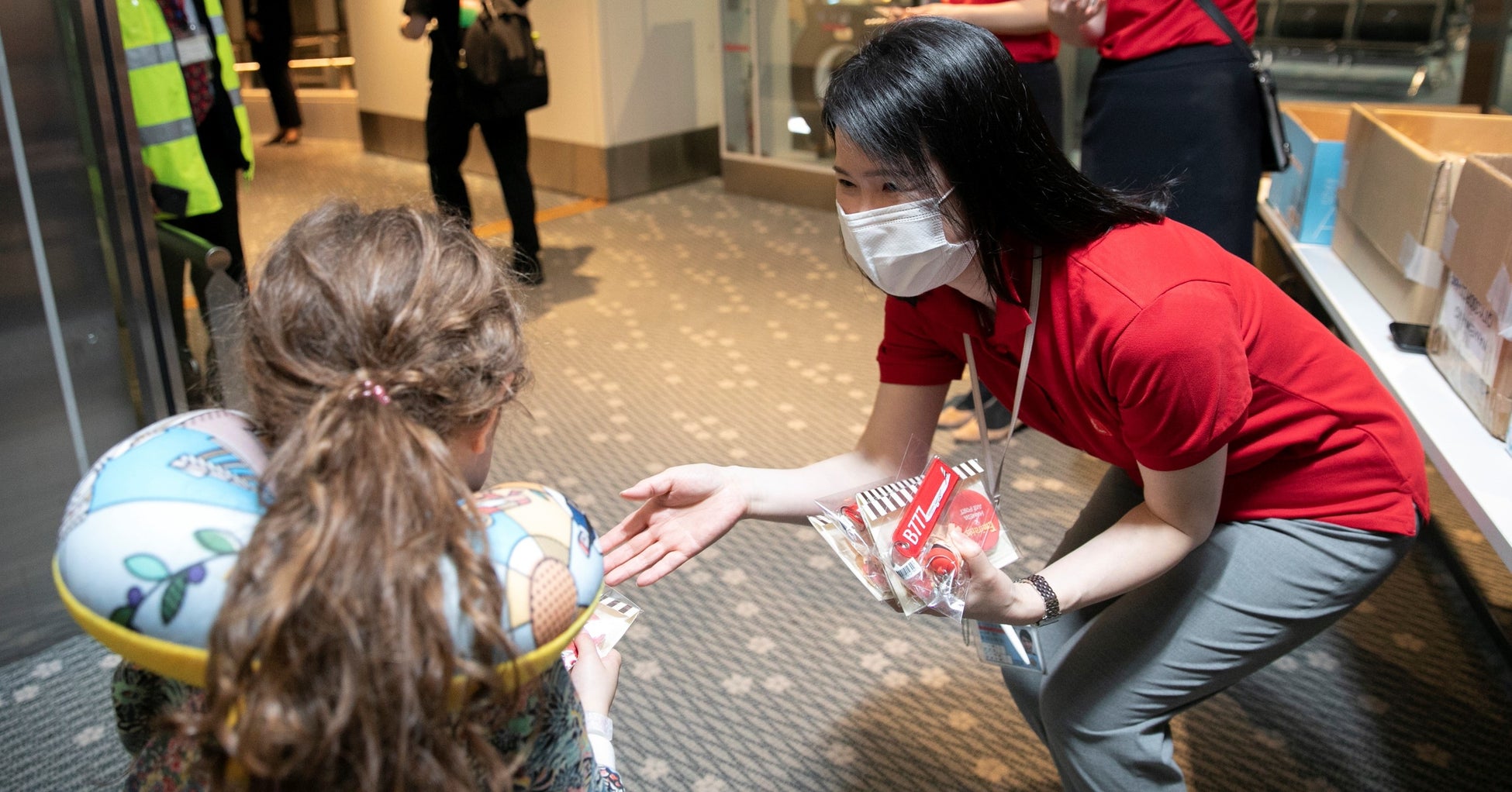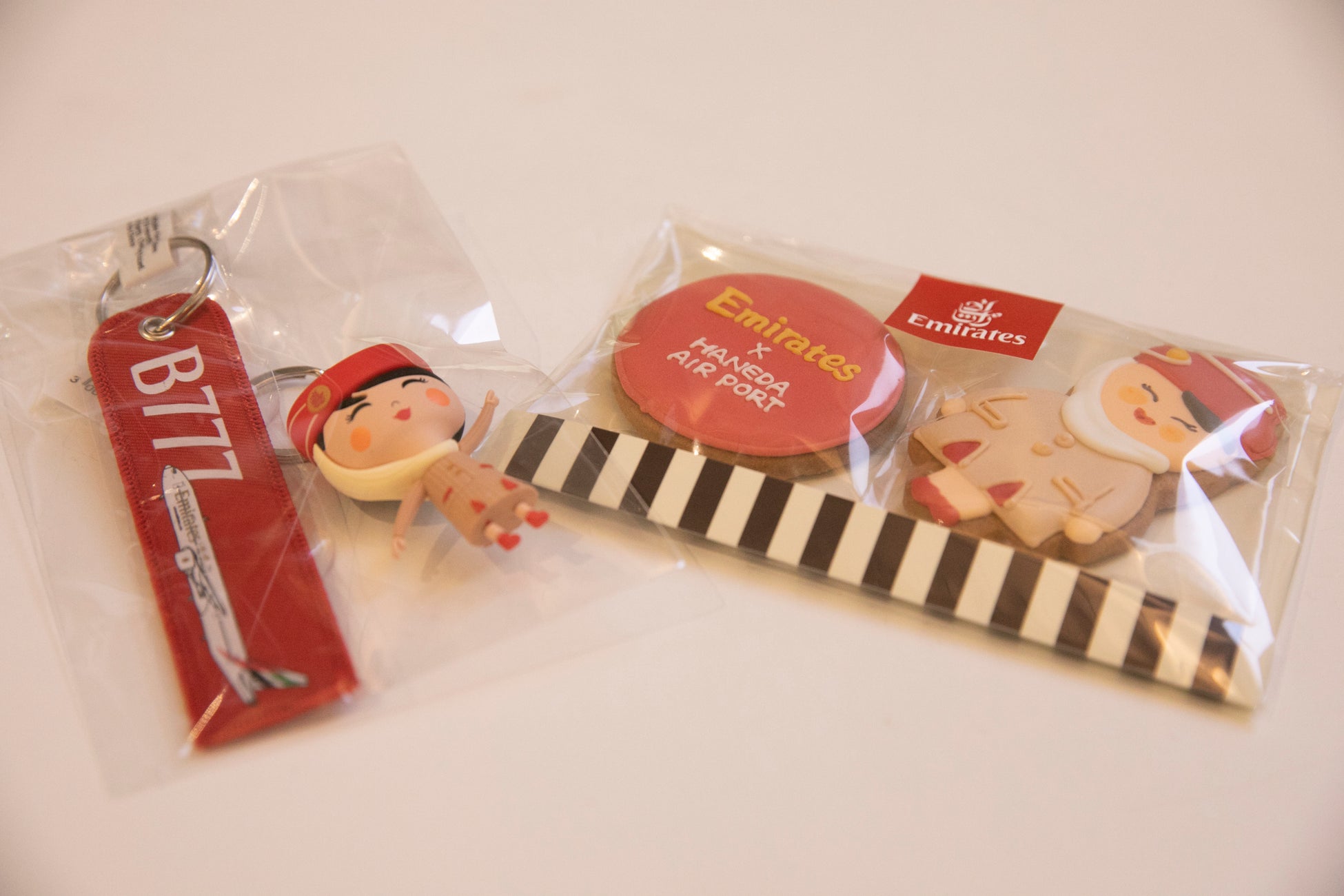 羽田便の再開を記念して、2023年4月3日の羽田発ドバイ線の搭乗客に、オリジナルのお菓子やオフィシャルグッズの記念品を配りました。