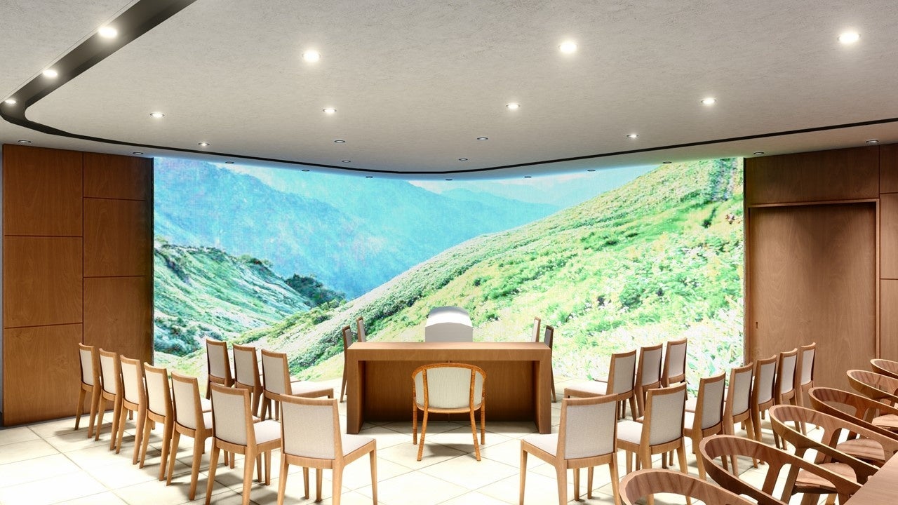 また、90度の滑らかなカーブを描く壁面に投影し会場を包み込むような形にすることで、奥行きのある祭壇映像を実現し、参列者も違和感なく安心してお見送りしていただけます。祭壇には思い入れある場所やお亡くなりになった方の好きだったものの映像なども投影でき、思い出と真心に溢れたお葬式を提供できます。