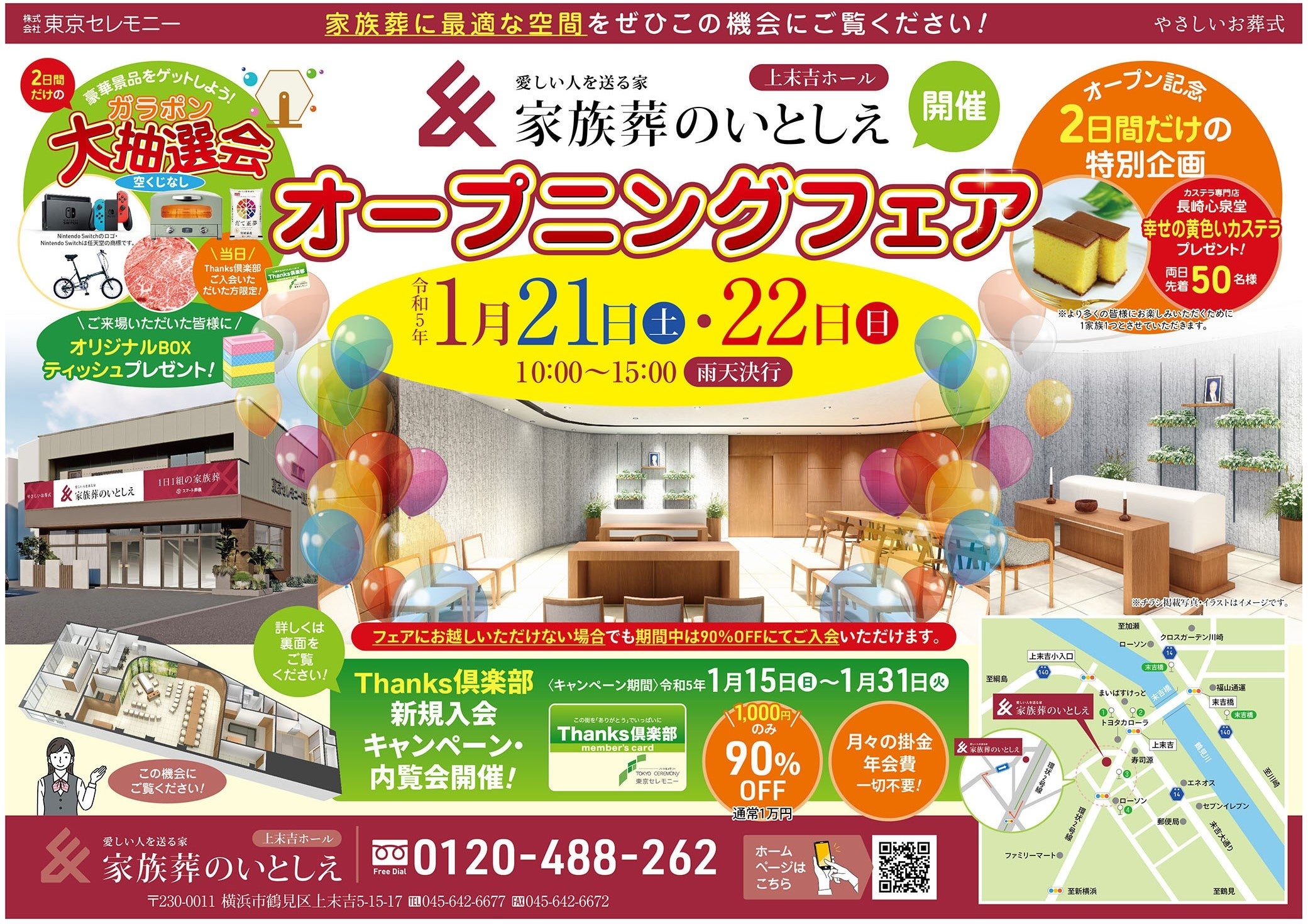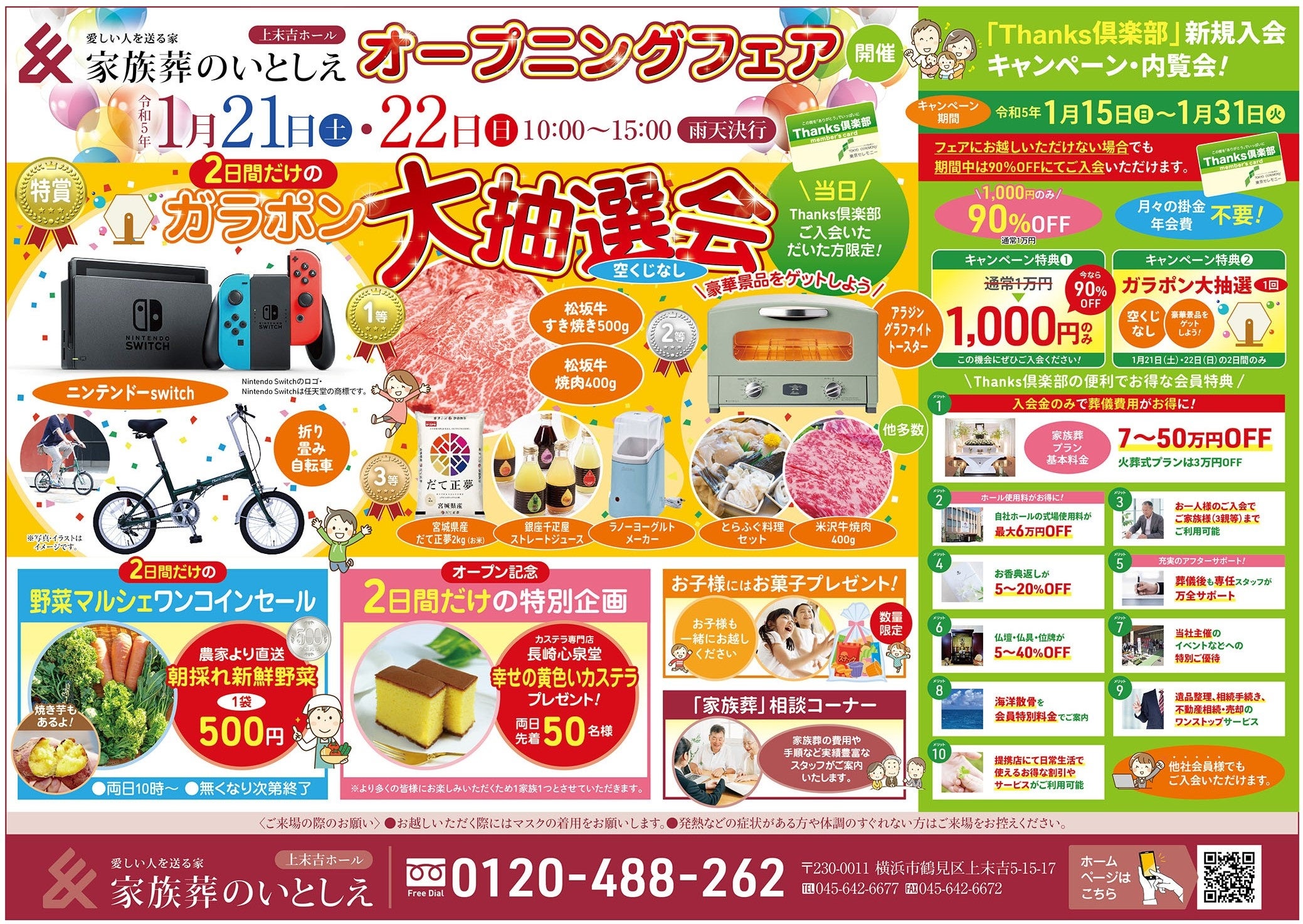 「上末吉ホール」のオープンを記念し、1月21日(土)・22日(日)の2日間オープニングフェアを開催。来場者には長崎心泉堂の「幸せの黄色いカステラ」プレゼント(両日先着50名様)や豪華賞品が当たる大抽選会も開催するほか、「家族葬」相談コーナーも設置します。