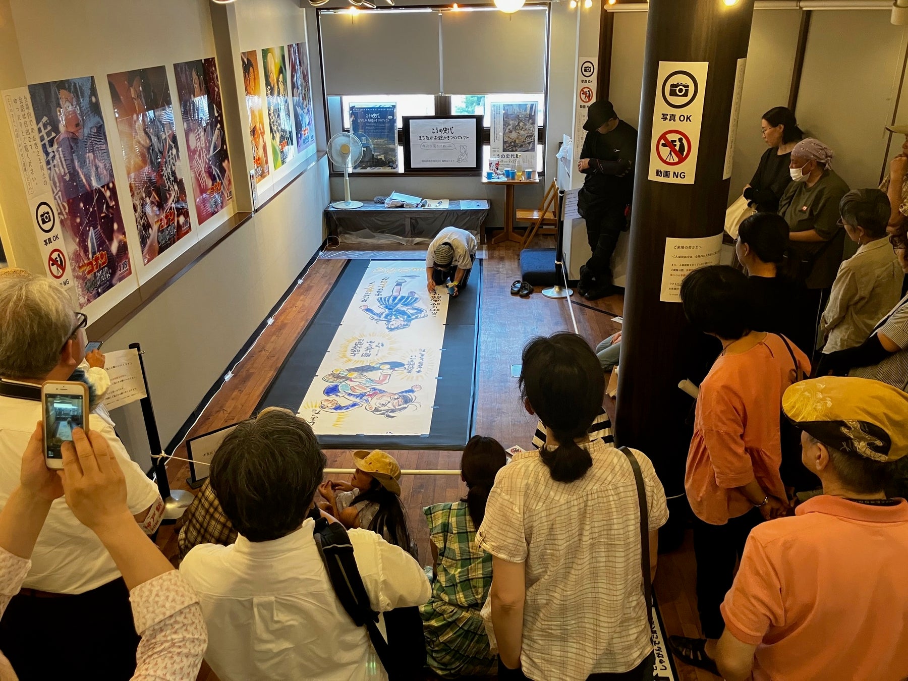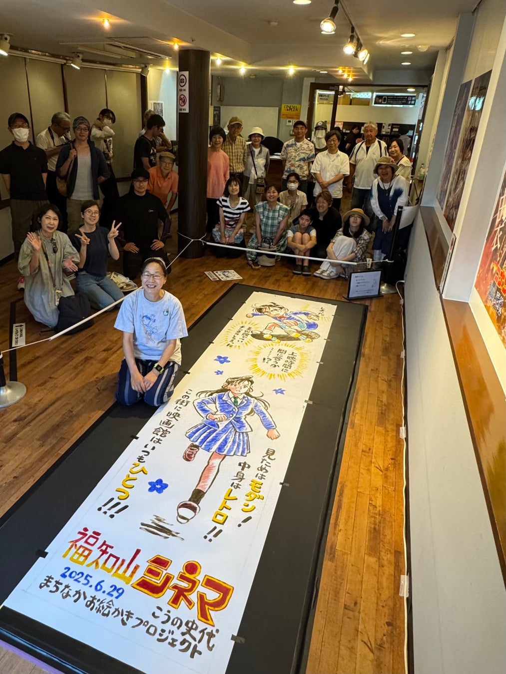 ○こうの史代さんは、福知山市のシティプロモーション企画「福知山の変」への登場が決まったことを契機に、福知山のまちと関わりながら創作をしようと「こうの史代まちなかお絵かきプロジェクト」を立ち上げました。架空の映画看板を描き下ろして掲出するほか、福知山城天守閣竜王の間や福知山シネマにてライブペインティングを行いました。
