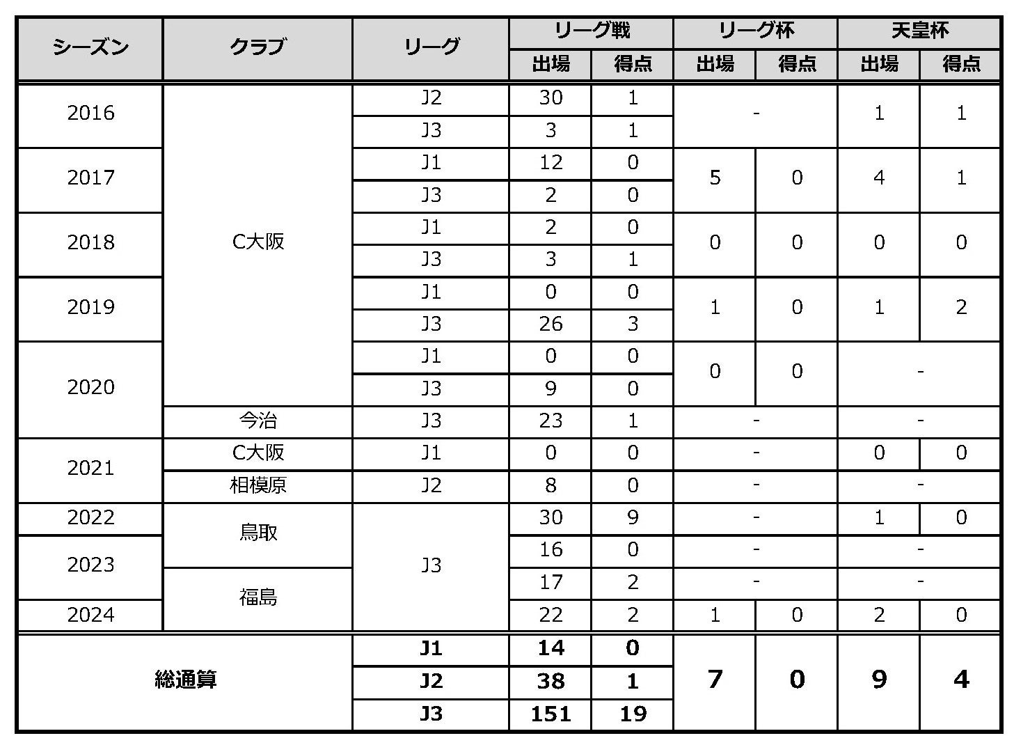 サッカー歴:三和スポーツ少年団→桜FC→飛龍高→大阪体育大→セレッソ大阪→FC今治→セレッソ大阪→SC相模原→セレッソ大阪→ガイナーレ鳥取→セレッソ大阪→福島ユナイテッドFC