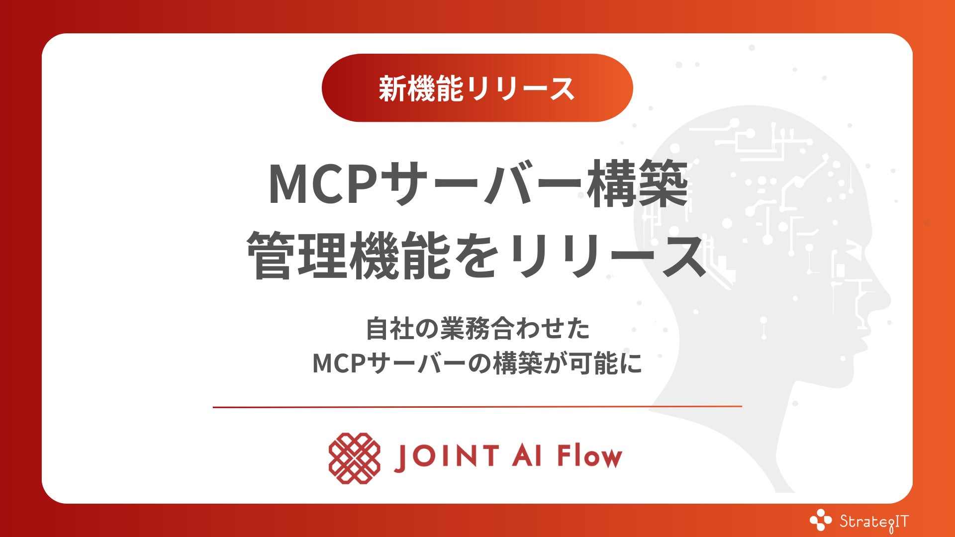株式会社ストラテジット(本社:東京都港区、代表:加藤 史恵、以下当社)は、iPaaS型AI活用プラットフォーム「JOINT AI Flow」において、自社専用のMCP(Model Context Protocol)サーバーの構築・管理を可能にする新機能をリリースしたことをお知らせします。