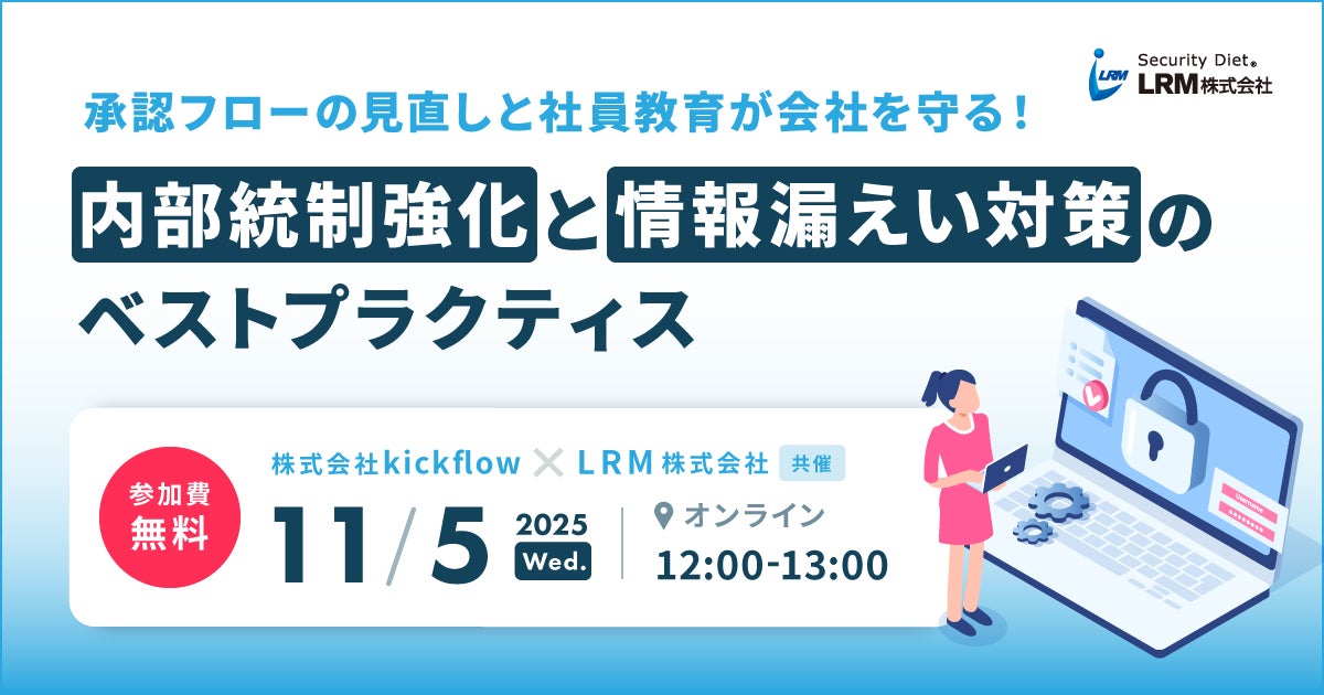 LRM株式会社(本社:兵庫県神戸市、代表取締役CEO:幸松哲也)、株式会社kickflow(本社:東京都千代田区、代表取締役:重松泰斗)は、2025年11月5日(水)12時から、内部統制強化と情報漏えい対策のベストプラクティスについて解説するセミナーを無料開催します。