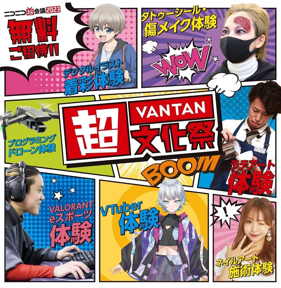 株式会社ドワンゴが主催する「ニコニコ超会議」は、「ニコニコのすべて(だいたい)を地上に再現する」をコンセプトに、動画サービス「ニコニコ」のユーザーが主体となりネットとリアルで開催するニコニコ最大のイベントで、3年ぶりのリアル開催となった2022年はリアル会場の来場者数は9万6,160人、ネット会場は総勢1,389万1,680人が来場しました。バンタンは、専門スキルを学ぶメンバーにより多くの実践経験の場を提供すべく、「バンタン超文化祭」として今年初出展。バンタンが運営する8スクールのメンバーが、人気アニメ「宇崎ちゃんは遊びたい!ω」とのコラボカフェやアニメキャラクターのデジタル着彩体験、VTuberなりきり体験やeスポーツのプロチームFAV gamingとのeスポーツ体験など、7つの体験の場を提供します。