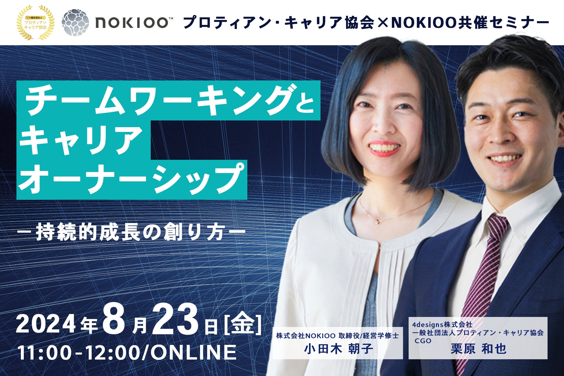 一般社団法人プロティアン・キャリア協会(東京都新宿区、代表理事:田中研之輔・有山徹、以下「当協会」)は、組織と個人のより良い関係構築と個人の主体的なキャリア開発を支援する団体です。この度、2024年8月23日(金) 11:00~「チームワーキングとキャリアオーナーシップ-持続的成長の創り方ー」をオンラインにて開催します。株式会社NOKIOO(所在地:静岡県浜松市、代表取締役:小川健三)のチームワーキング、当協会のキャリア自律トレーニングの実例を通して、「メンバーのエンゲージメントを高め、どのように自律的な意欲と行動を促すか」「多様なメンバーが、相互に効果的に関わり合う組織創りのポイント」などを解説します。