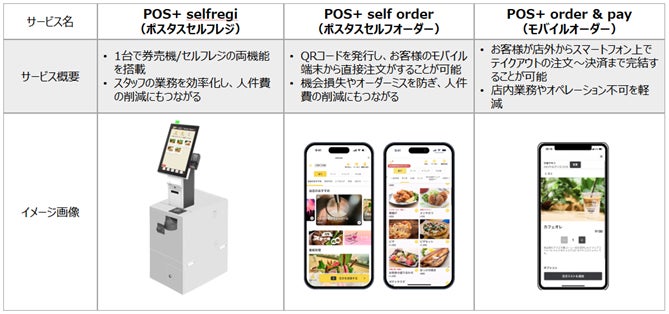 「POS+」は、店舗の売上向上や店舗運営担当者の業務負担軽減による生産性向上を実現し、また従業員にとって 利便性の高い機能を搭載する店舗向けソリューションです。飲食店向け「POS+ food」や小売業向け「POS+ retail」、理美容向け「POS+ beauty」、クリニック向けの「POS+ healthcare」のクラウド型モバイルPOSレジをはじめ、セルフレジ・券売機「POS+ selfregi」、モバイルセルフオーダーサービス「POS+ self order」、テーブルトップオーダーサービス「POS+ TTO」などの様々なソリューションで、効率的な店舗運営を支援いたします。