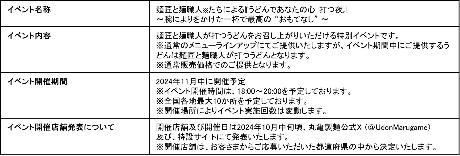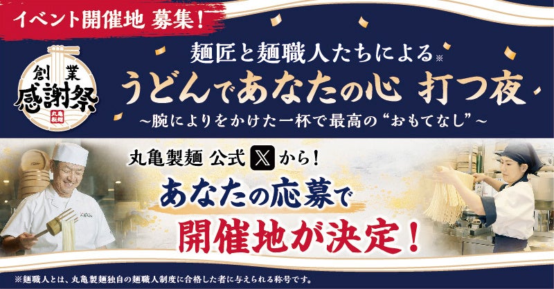 麺匠と麺職人たちによる「うどんであなたの心 打つ夜(よる)」~腕によりをかけた一杯で最高の“おもてなし”~を開催 2024年9月11日(水)より、イベント開催先の都道府県を丸亀製麺公式Xにて募集開始
