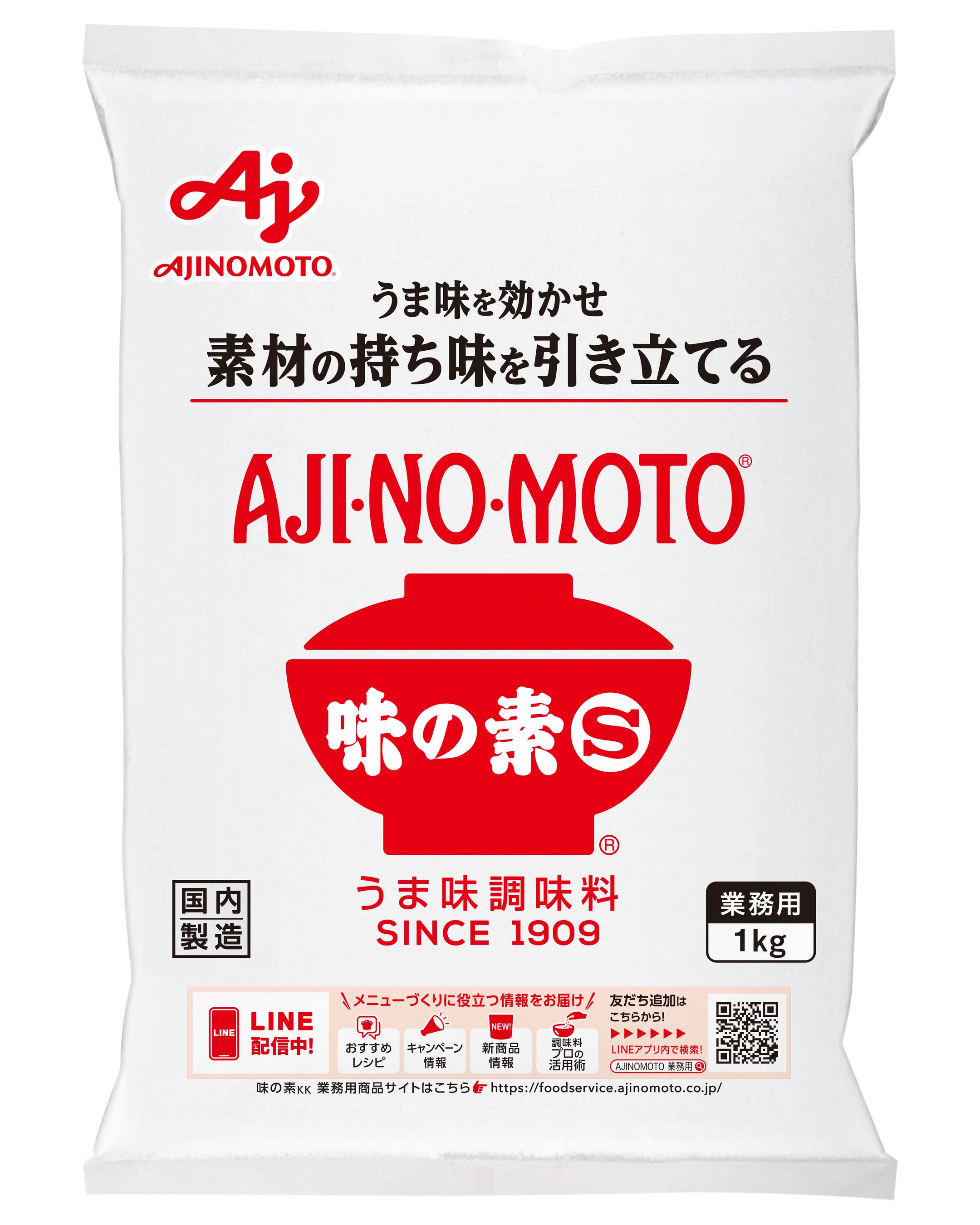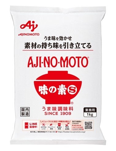 リニューアルポイント:うま味調味料「味の素®」は、グローバルブランドロゴを2023年10月以降順次リニューアルしており、今回業務用「味の素ⓢ®」も新しいロゴにパッケージデザインをリニューアルします。