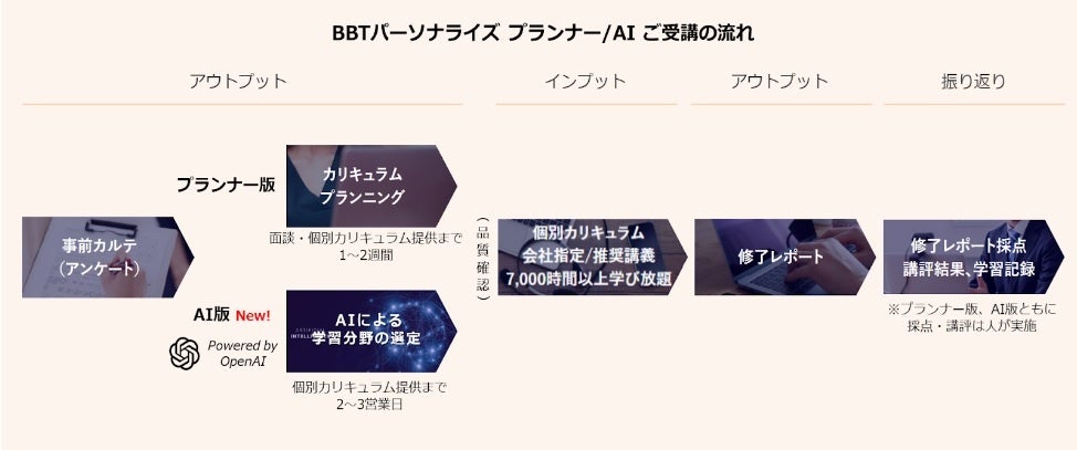 BBTパーソナライズ(以下BBTP)は、従来からカリキュラムプランナーが一人ひとりの学習ニーズと職業目標を踏まえ、個別にカスタマイズされた教育カリキュラムを提供してきました。今回新たにリリースするBBTP AIは、このサービスの長年の経験と知見を基に、従来のパーソナライズされた映像講座の選定を維持しながらも、AIの導入により受講者に対してより迅速にカリキュラムを提供できるようになり、効率的な学習が可能となります。