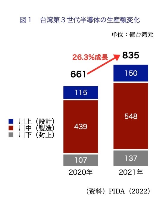 半導体産業チェーンが世界で最も整備されている台湾は第3世代半導体の分野を強化する上で有利な条件を備えている。台湾の第3世代半導体産業(発光ダイオード=LEDを除く)の2021年の生産額は835億台湾元だった。