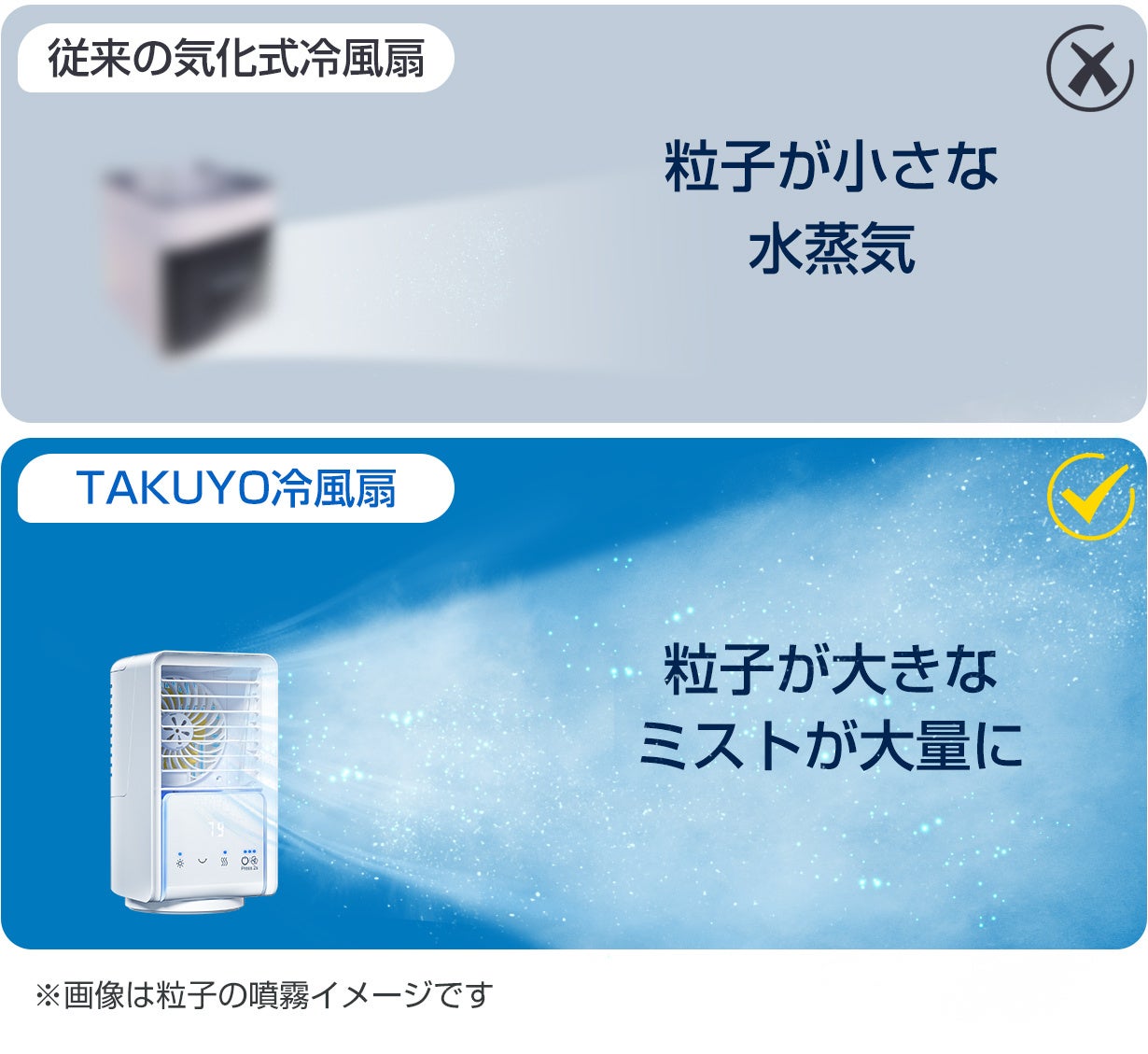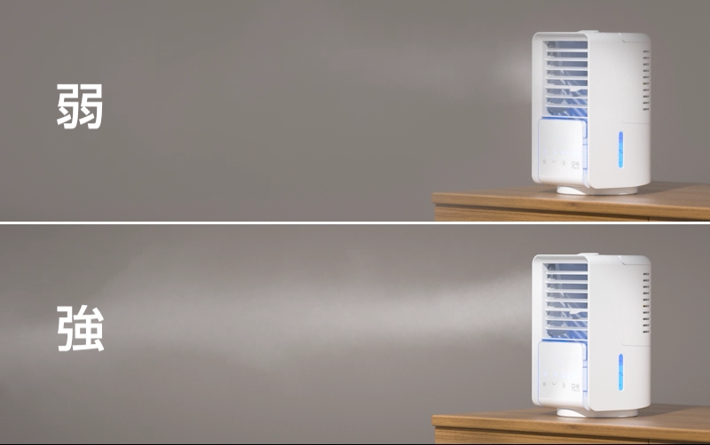 超音波式で発生する「ミスト」は、一般的な冷風扇の「水蒸気」よりも大きな水の粒子が大量に吹きつけますので、加湿効果もあります。