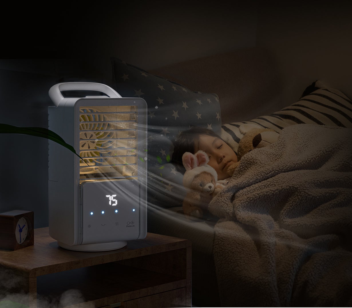 加湿効果により、エアコンの風で肌が乾燥する心配もなく、加湿器の代わりにもなります。