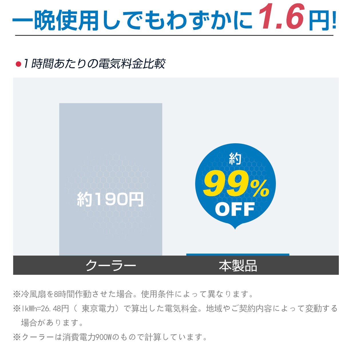 さらに!自然な冷風を送る構造となっている為、消費電力は約8W程度で一時間あたりの電気代は僅か1.6円!クーラーに比べ圧倒的に抑えることができ、家計には大助かることに違いません。
