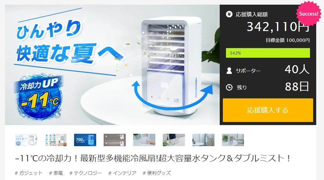 【公開僅か20分で目標金額達成】「-11℃の冷却力!最新型多機能冷風扇!超大容量水タンク&ダブルミスト!」がMAKUAKEにて公開しました!