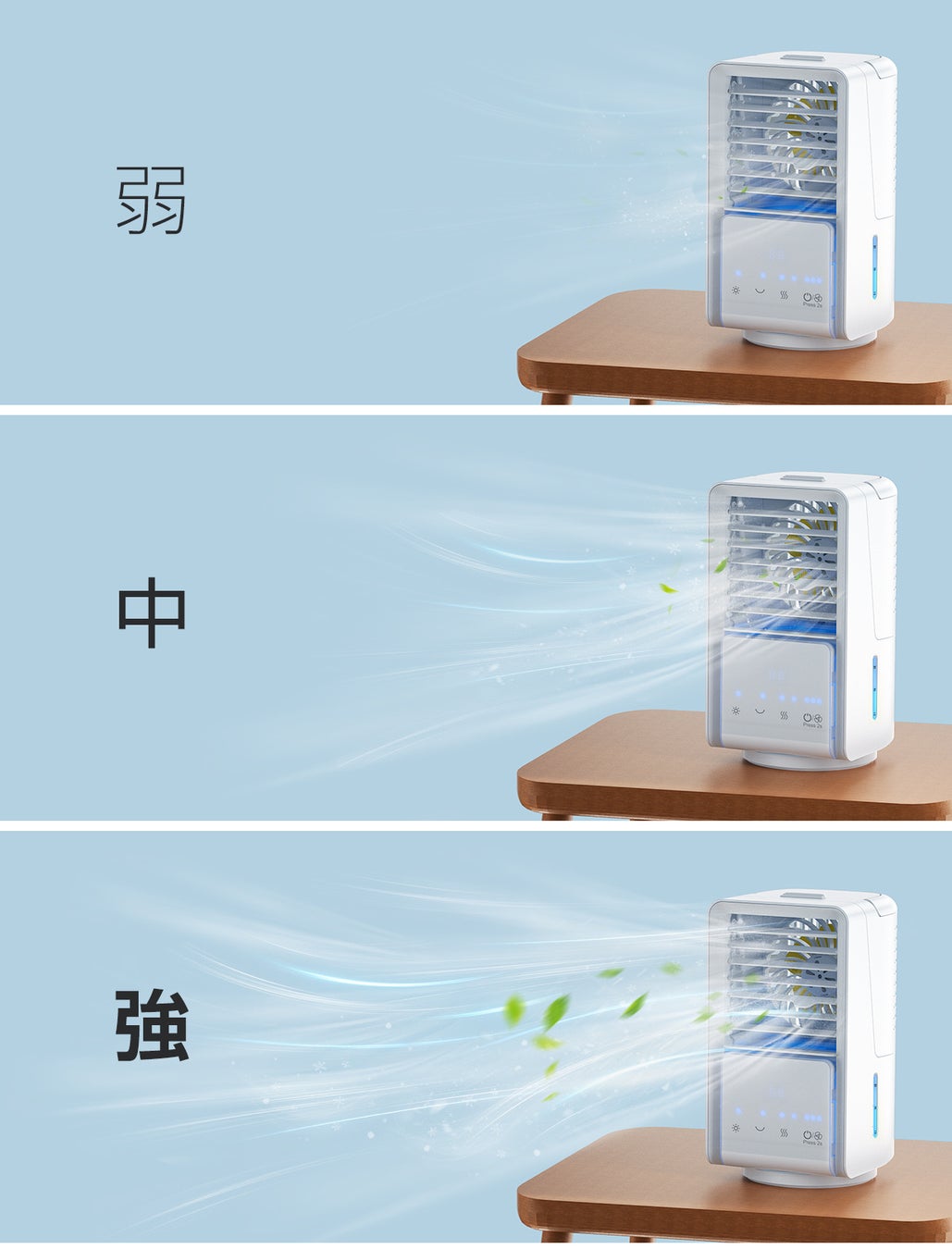 風量は弱、中、強の3段階で調節が可能です。ワンタッチで風量の切り替えができるのでご使用シーンに合わせてお好みの風量に調節してください。