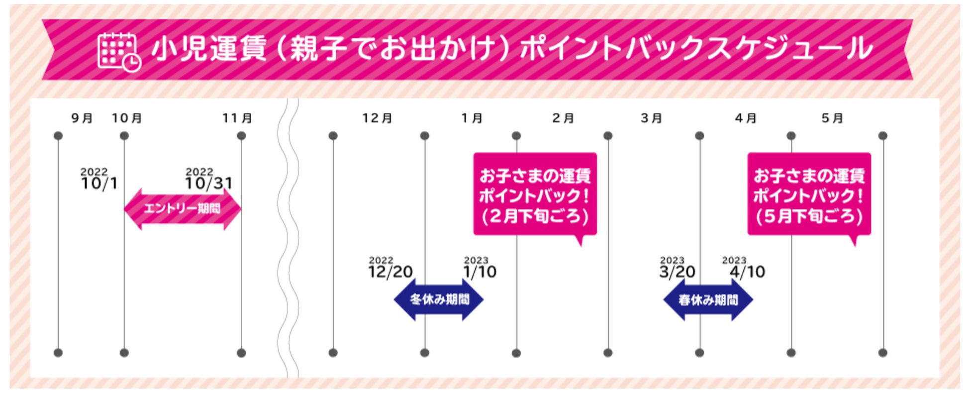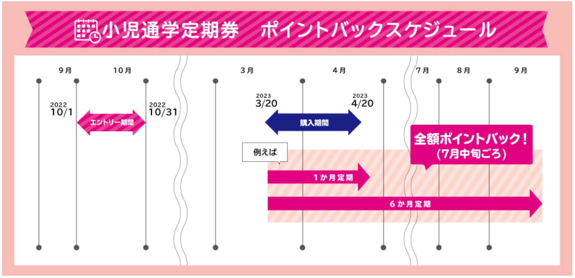 ※小児通学定期券代の全額ポイントバックおよび長期休み小児運賃ポイントバックを受けるには、エントリー期間にエントリーが必要となります。