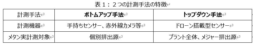 特にメタンは、近年その排出防止対策の必要性が高まっている一方、その排出は設備によるばらつきが大きく、一般的な係数を用いたデスクトップ(机上)算定では精度が不十分であるため、実計測による排出量の把握が国際的に強く推奨されています。このため、本プロジェクトでは、現場での手持ちセンサーや赤外線カメラを用いたボトムアップ手法と、ドローンを用いた上空からの把握によるトップダウン手法という2つの計測手法を組み合わせて実計測を実施しました(下記図1参照)。具体的には、ボトムアップ手法ではFPSO内でメタン排出の可能性がある約15,000箇所を計測しており、トップダウン手法ではFPSOを囲うようにドローンが飛行することによりプラント全体の排出の俯瞰的把握を実現しています。