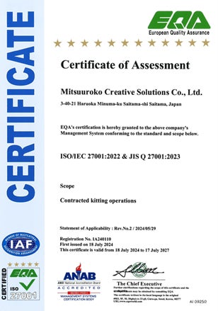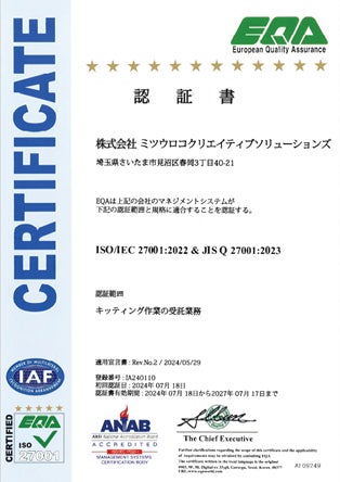 株式会社ミツウロコグループホールディングス連結子会社である株式会社ミツウロコクリエイティブソリューションズ(本社:埼玉県さいたま市、代表取締役社長:児島 和洋、以下「MSC」)は2024年7月18日にキッティング作業の受託業務において、情報セキュリティマネジメントシステム(ISMS)の国際規格「ISO/IEC 27001:2022」の認証を、審査登録機関であるEQA国際認証センターより取得しました。