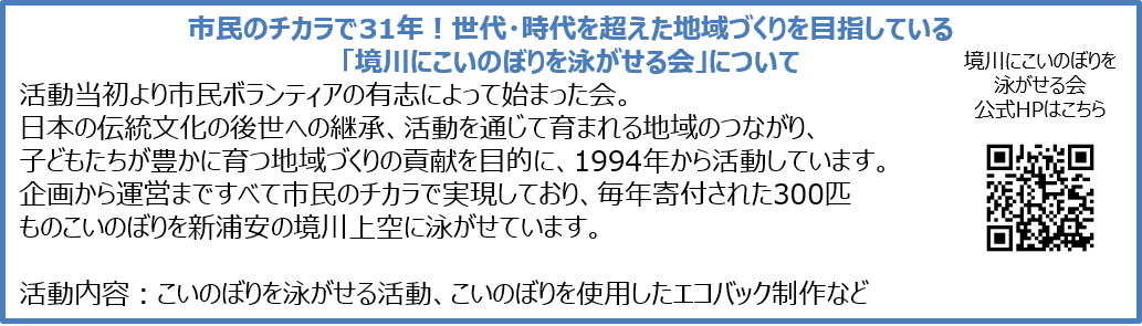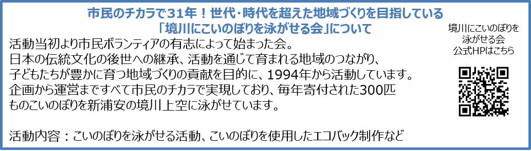 完成した夢こいのぼりは、4月22日(月)~5月4日(土・祝)の期間、アトレ新浦安1F ガーデンテラスに展示後、5月5日(日・祝)に開催される「第31回 境川にこいのぼりを泳がせよう!イベント」 に展示されます。