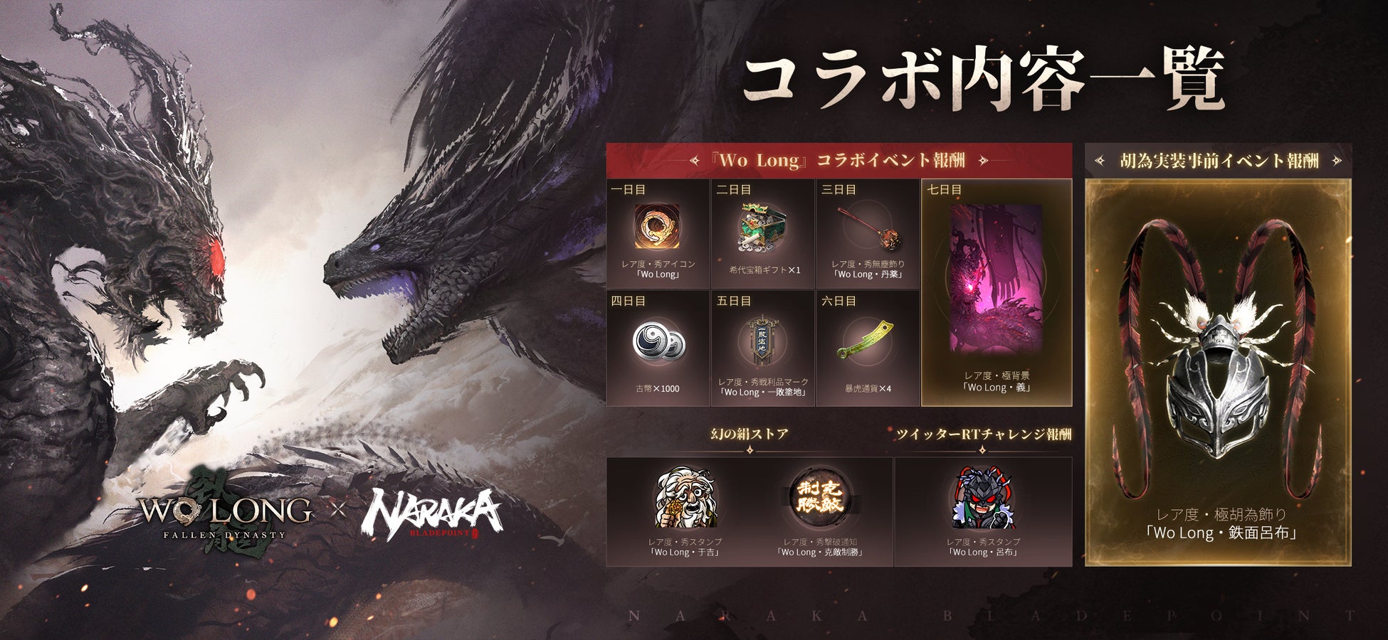 また、『Wo Long』に属した数多くの重要な要素も、腰飾り、スタンプ、アイコンなどの形で『NARAKA』に登場しました。3月3日から23日まで、『NARAKA』にログインすることだけで、コラボコンテンツが獲得できます!コラボイベント内容に関する詳しい情報はこの一覧図をご覧ください!様々な報酬が待っているので、是非お見逃しなく!