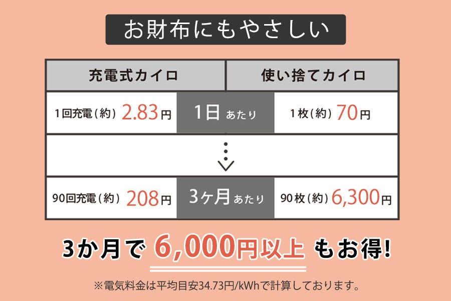 使い捨てカイロに比べ、充電式カイロは繰り返し使えるため、約3ヵ月でこんなにお得に!