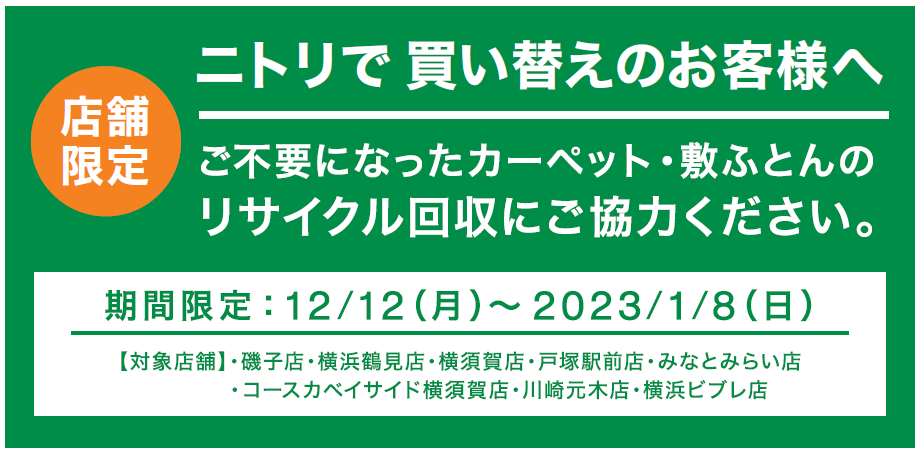 この度、そんなお客様のお困りごとをなんとか解消できないか、という想いから、ご不要になったカーペット・敷ふとんを販売元にかかわらず、神奈川県の8店舗で無料回収することを、ニトリ初の取り組みとして決定いたしました。(ニトリで対象商品を一定金額以上ご購入のお客様限定)