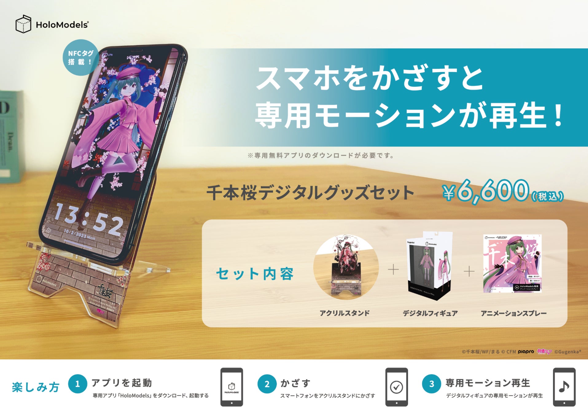 NFCに対応したホロモデル専用オリジナルアクリルスタンドとデジタルフィギュアやアニメーションがセットになった「千本桜デジタルグッズセット」を物販コーナーで販売します。
