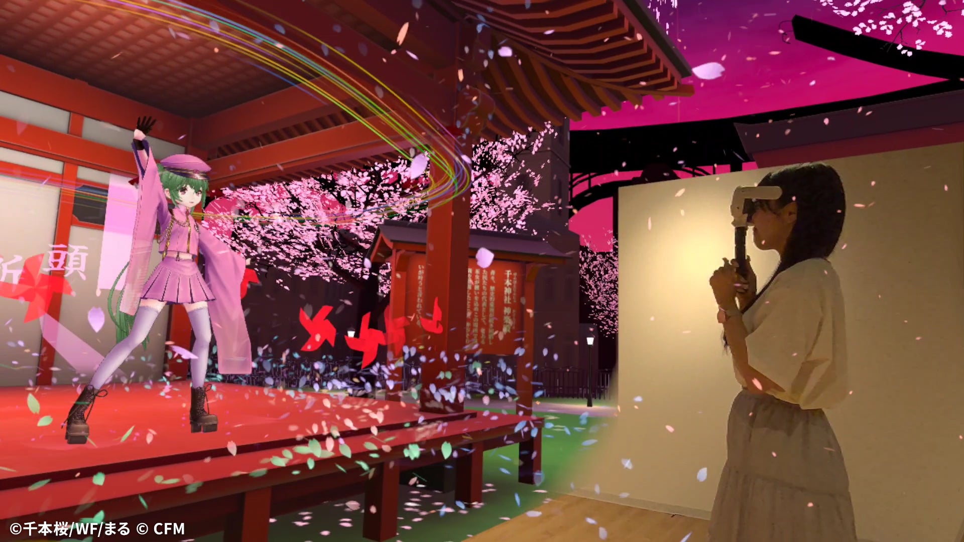 等身大の初音ミクのパフォーマンスが最先端技術により、3Dゴーグルを通して目の前の現実空間と融合します。千本桜衣装の初音ミクを至近距離で鑑賞でき、桜吹雪や風車など楽曲に合わせたエフェクト演出で見ごたえのある複合現実ライブを体験できます。