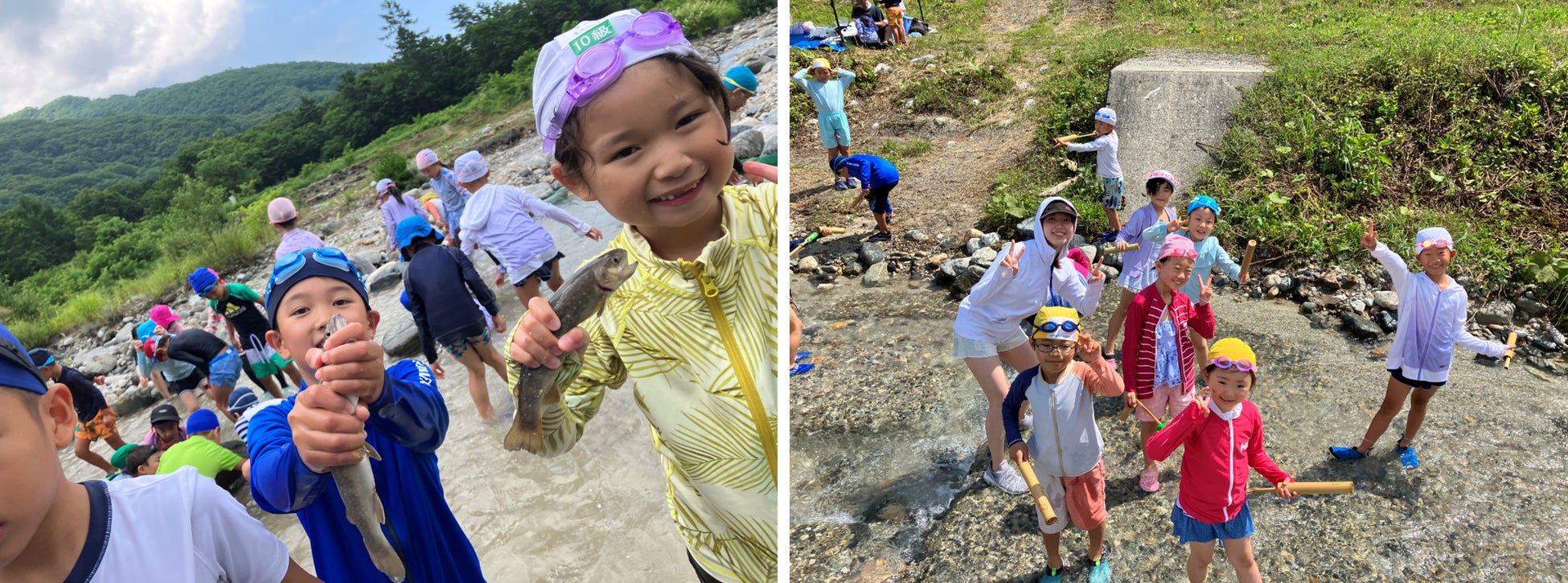 川遊びは魚のつかみ取りも行っている、流れがとても穏やかな浅瀬で行う為、安全な環境で楽しむことができます。