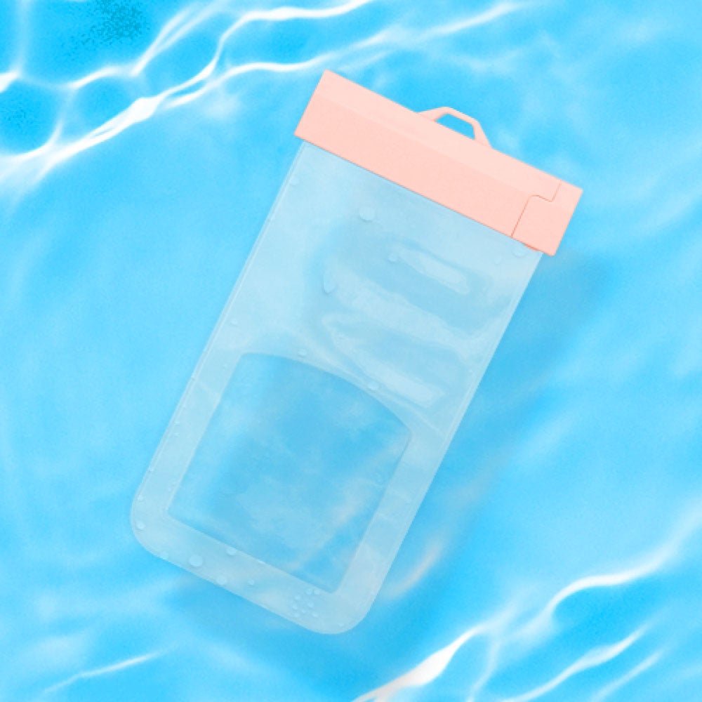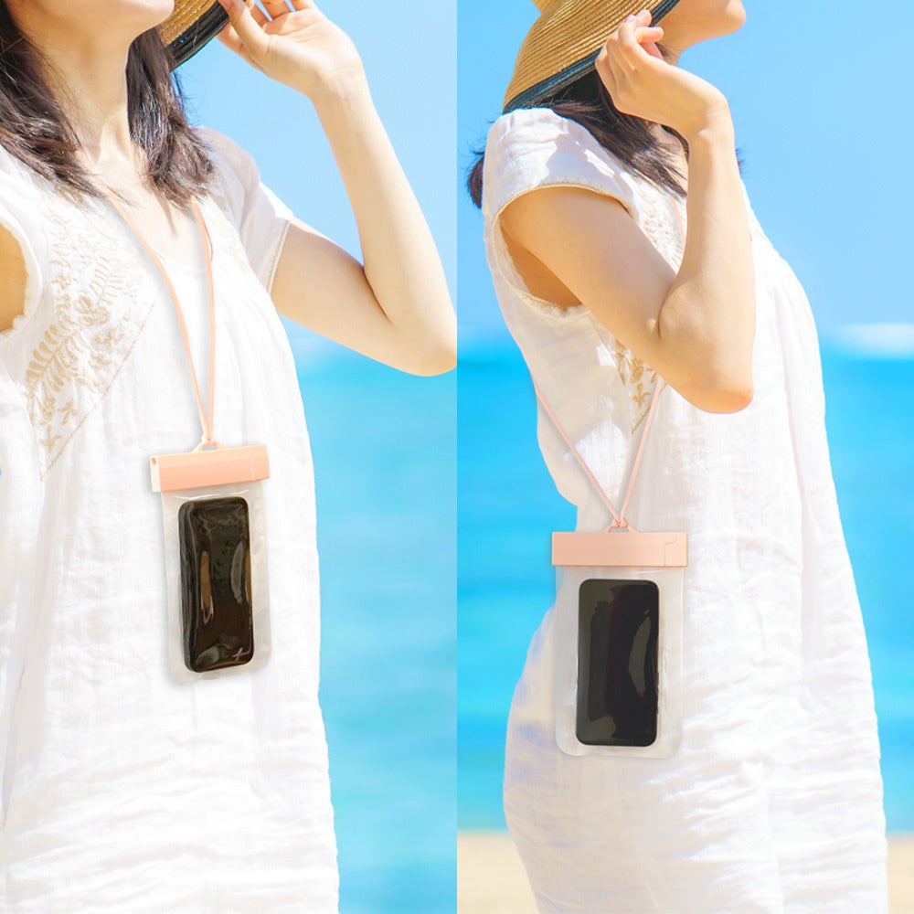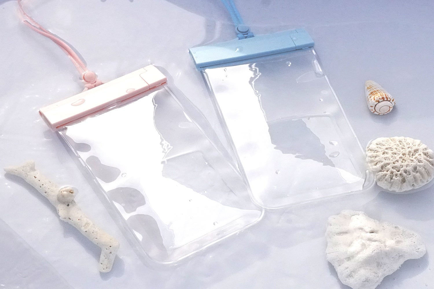 ニュアンスカラーが特長的な、シンプルデザインのスマートフォン用防水ケースです。チャック袋をクリップで留めるユニークな構造で、フラットな開口部がミニマルさを演出します。