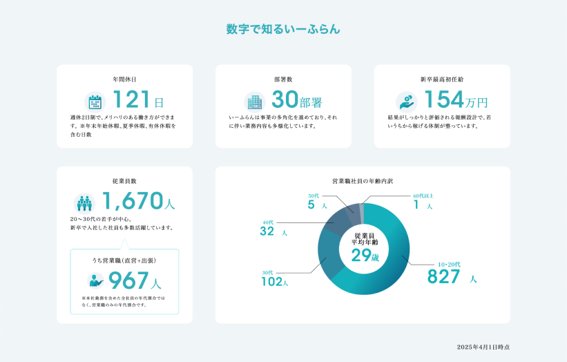 いーふらんでは、「社員幸福満足度日本一」を目指し、その他にも様々な福利厚生制度を導入しています。今後も、社員が安心して長く働ける環境づくりに努めてまいります。