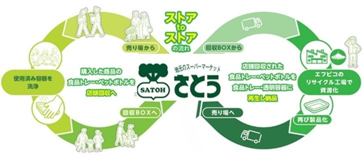 エフピコとファミリーストアさとうは、「お店がその地域のエコリーダー」となることを目指し、地域の皆様の使用済み食品トレーやペットボトルをファミリーストアさとう店舗にお持ちいただき、店頭に設置している回収ボックスにて回収しております。回収した使用済み食品トレー・ペットボトルはすべてエフピコの資源として活用され、これらの回収資源から製造したエコ製品「エコトレー」「エコAPET」「エコOPET」を再びファミリーストアさとうの売り場で使用することで、循環型の水平リサイクルを実現してまいります。