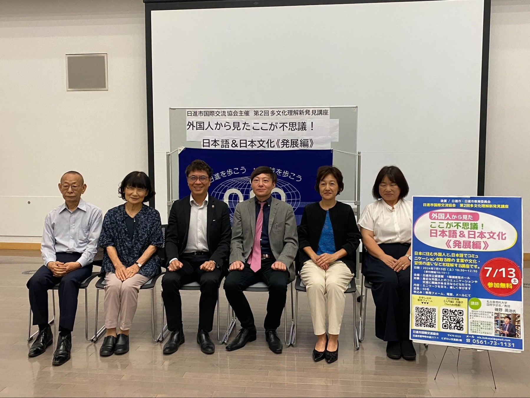 2024年7月13日(土)に実施された日進市国際交流協会主催「第2回多文化理解新発見講座」にて、名古屋商科大学国際学部長 磯野英治教授による講演が行われました。今回は昨年7月に行われた「外国人から見た!ここが不思議! 日本語&日本文化【入門編】」の発展編として、外国人の定住者、留学生、そして日本人が同じ地域で一緒に暮らしていく上で必要なことを、グループワークも交えながら学びました。定員50名の募集に対して60名を超える参加があり、大変盛況な講演会となりました。