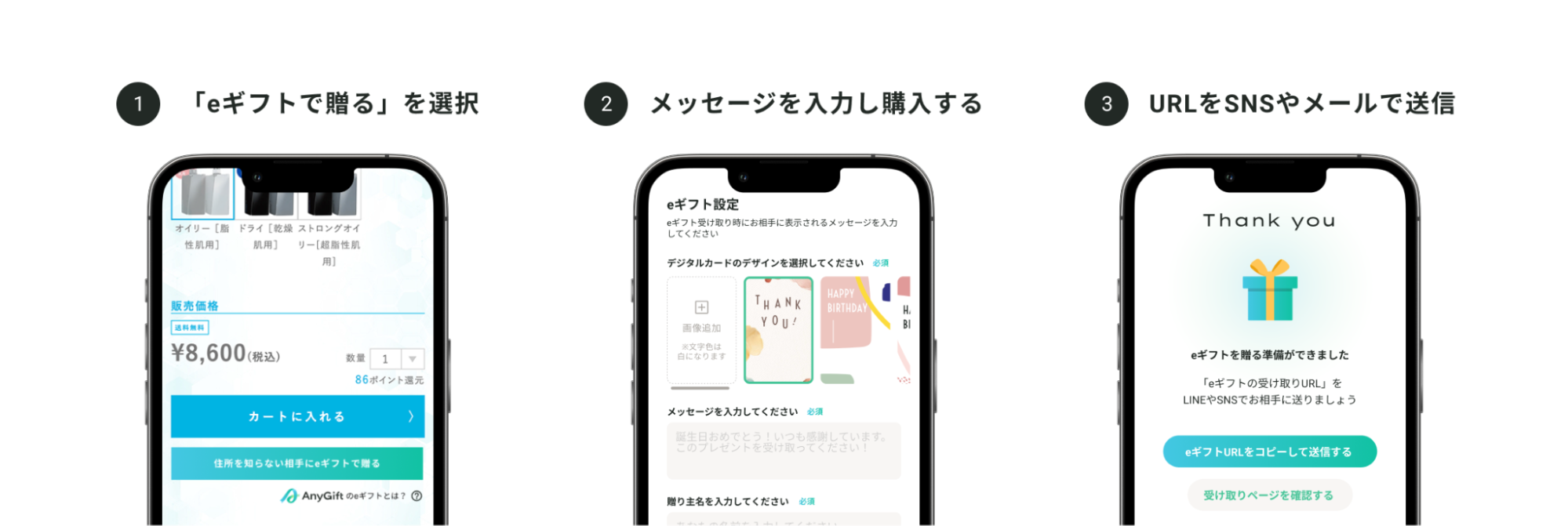 AnyGiftは、相手の住所を知らなくてもLINEやメールで贈ることができる「eギフト機能」を、ECサイトに組み込むことができるサービスです。