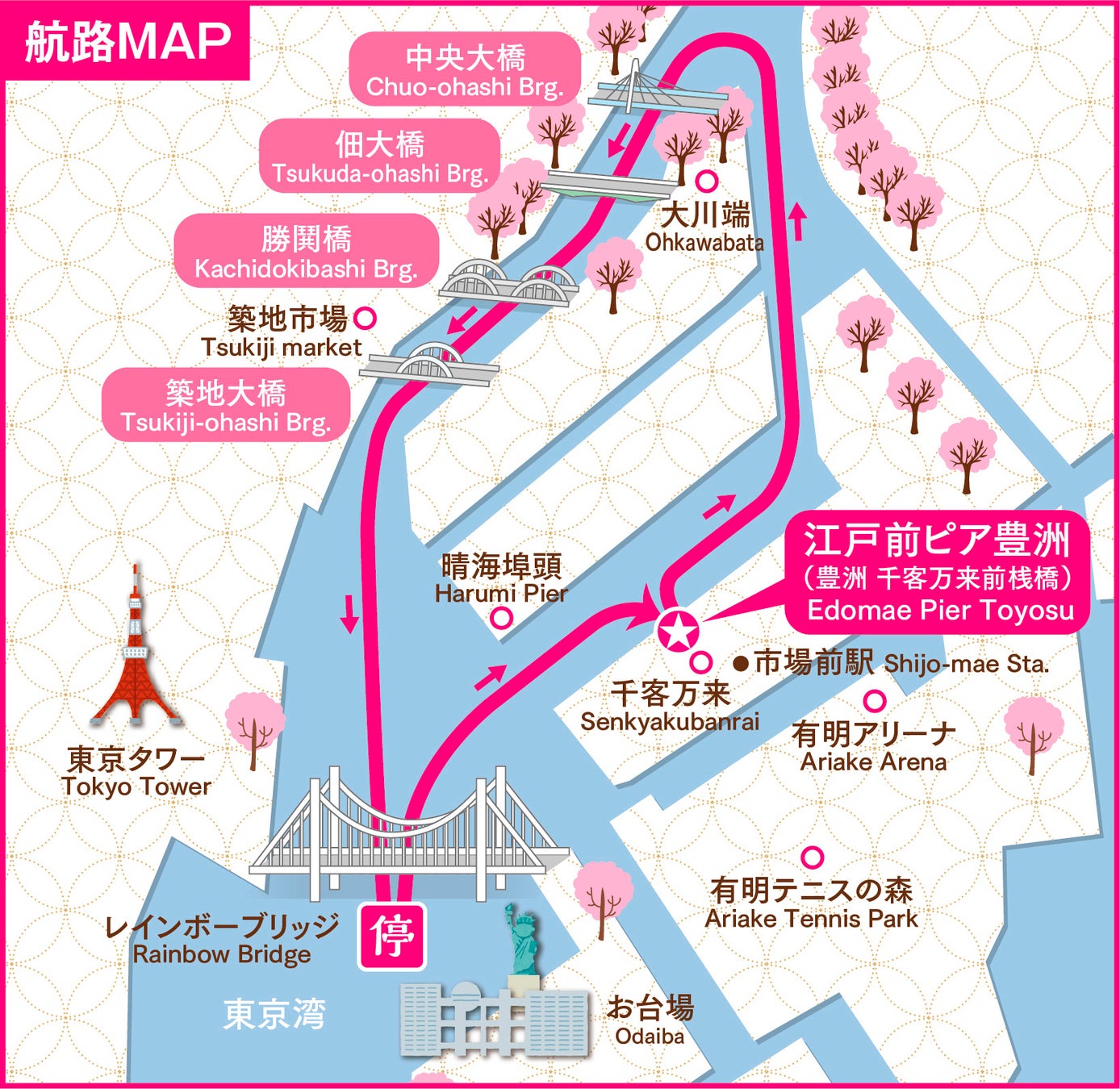 「豊洲 千客万来」前の「江戸前ピア豊洲(桟橋)」から出航して大川端エリアを回り、重要文化財である勝鬨(かちどき)橋などの橋やレインボーブリッジをくぐりながら、お台場エリアで停泊し「江戸前ピア豊洲(桟橋)」に戻る、75分程度のコースをお楽しみいただけます。