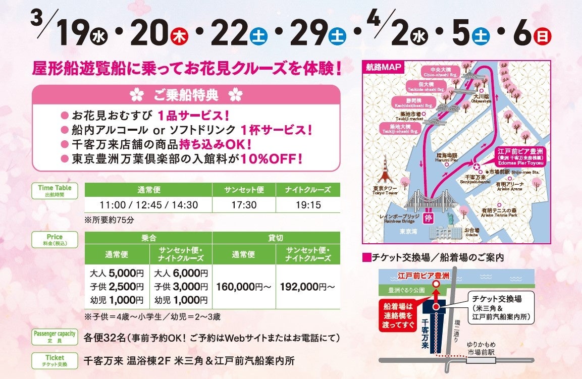 豊洲 千客万来前 発着!タイパ・コスパ重視のお花見屋形船遊覧クルーズ登場!
