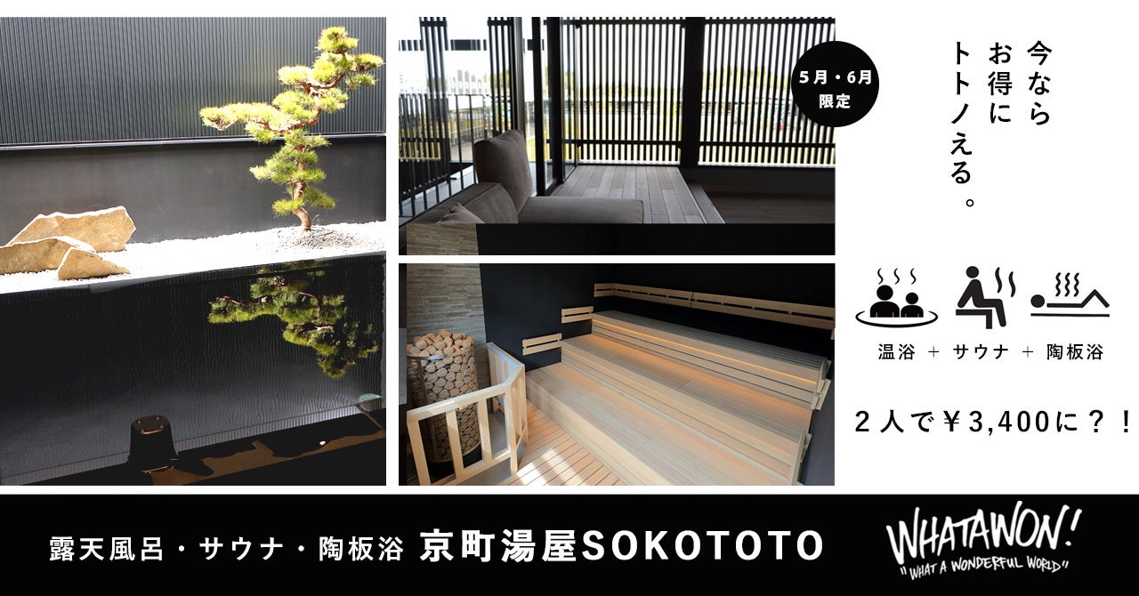 【5月・6月限定開催】今ならお得にトトノえる、京町湯屋SOKOTOTO|ワタワン、毎週水曜日はペア割りキャンペーンでお風呂もサウナも、陶板浴も!