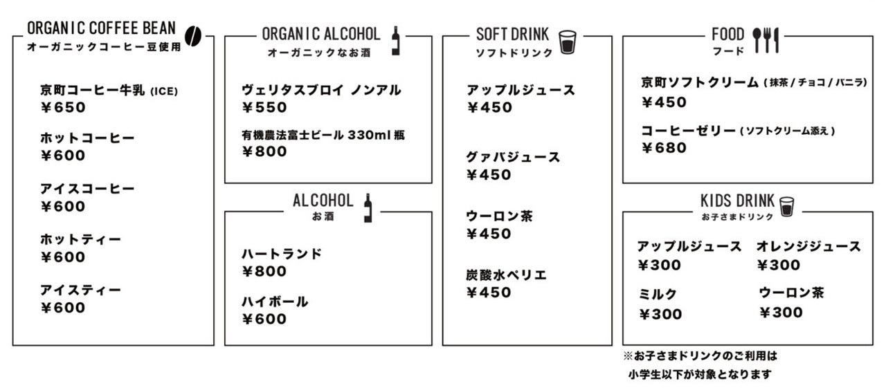 ・京町コーヒー牛乳(ICE)¥650・ホットコーヒー¥600・アイスコーヒー¥600・ホットティー¥600・アイスティー¥600・ヴェリタスブロイ ノンアル¥550・有機農法富士ビール 330ml 瓶¥800・ハートランド¥800・ハイボール¥600・アップルジュース¥450・グァバジュース¥450・ウーロン茶¥450・炭酸水ペリエ¥450