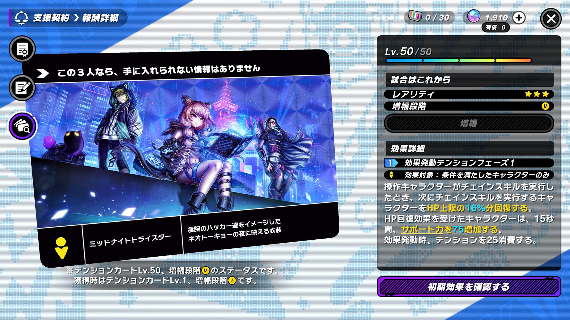 基礎支援:エニグマエンティティやおたのしみボックスなどのアイテムを、契約レベルを上げることで獲得できます。 武装支援:契約レベルの到達報酬で獲得できる報酬に限定コスチュームと限定★3テンションカードが追加されます。 最高水準:即時に契約レベルが10上昇し、限定ネームカードバナーやシンクロメダルなどのアイテムを獲得できます。 |