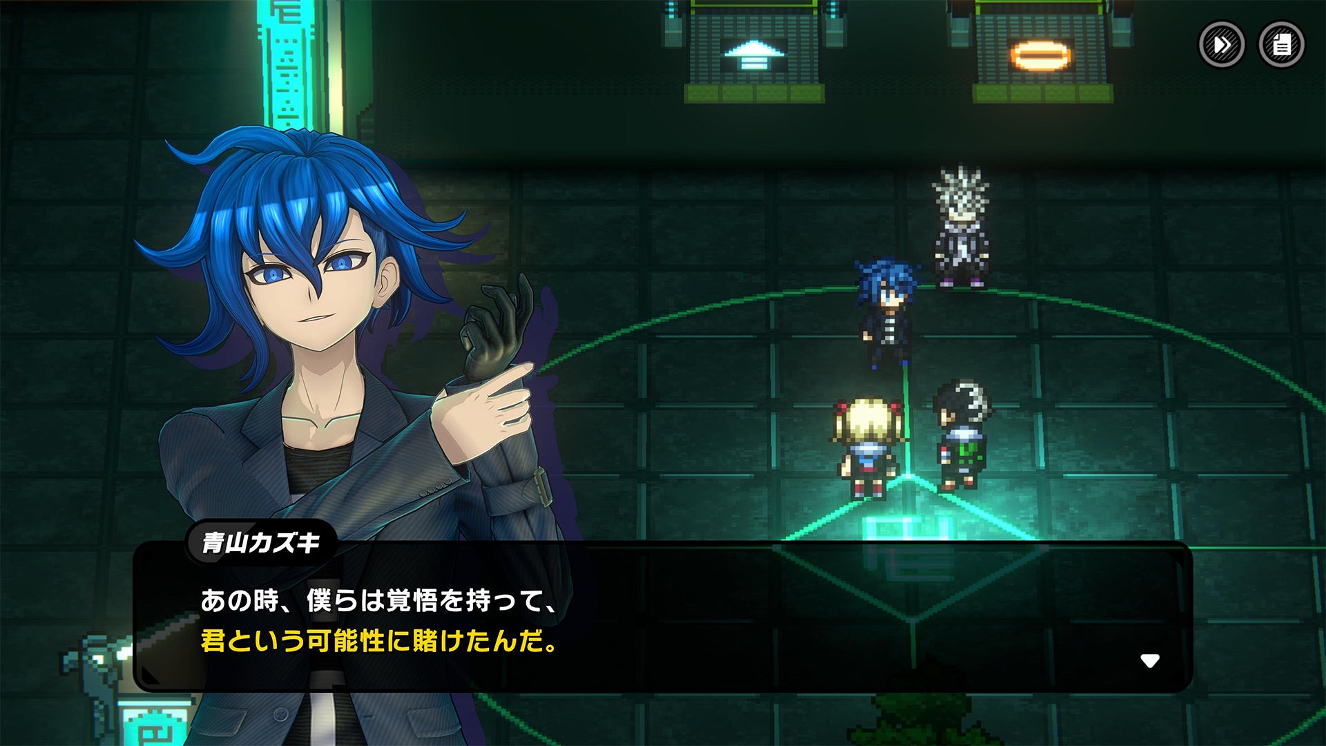 『トライブナイン』の探索パートでは、2Dドットで描かれたネオートーキョー国のシティを、実際にキャラクターを操作しながら冒険することで、ストーリーを進行していきます。